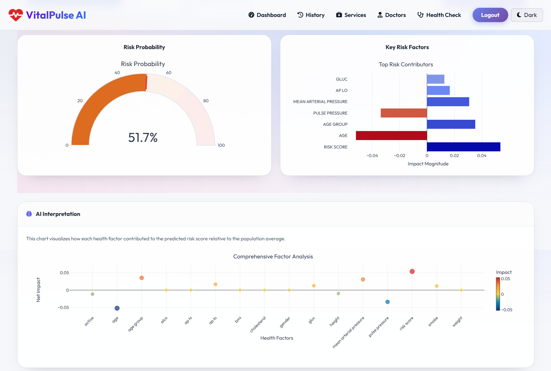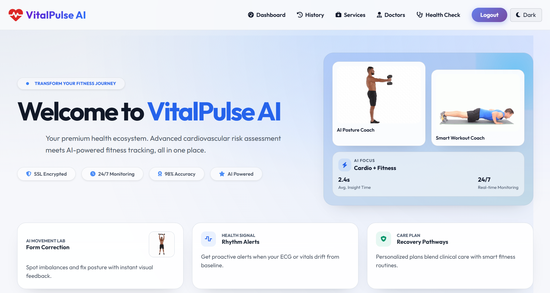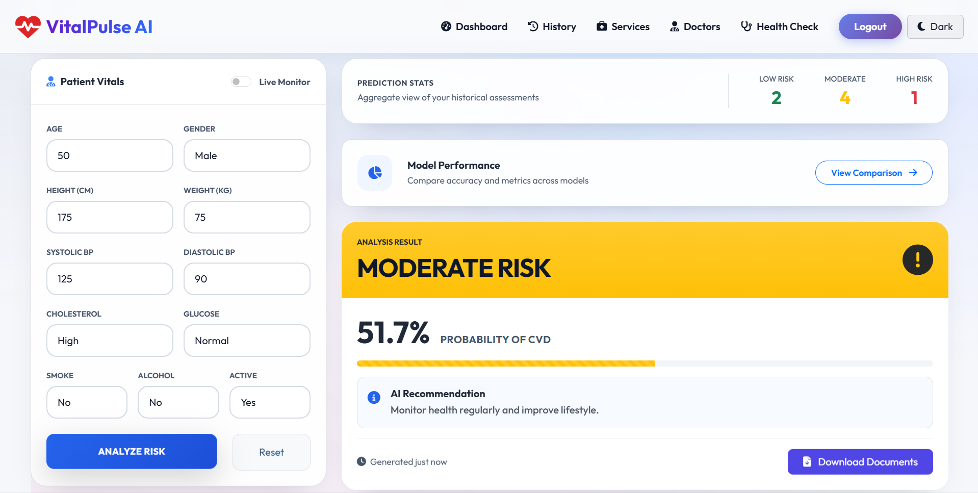 VitalPulse AI is an end-to-end cardiovascular intelligence and comprehensive health platform. At its core, a deep learning model trained on 56,000+ real biomedical records analyzes patient vitals and returns a cardiovascular risk probability classified as Low, Moderate, or High.