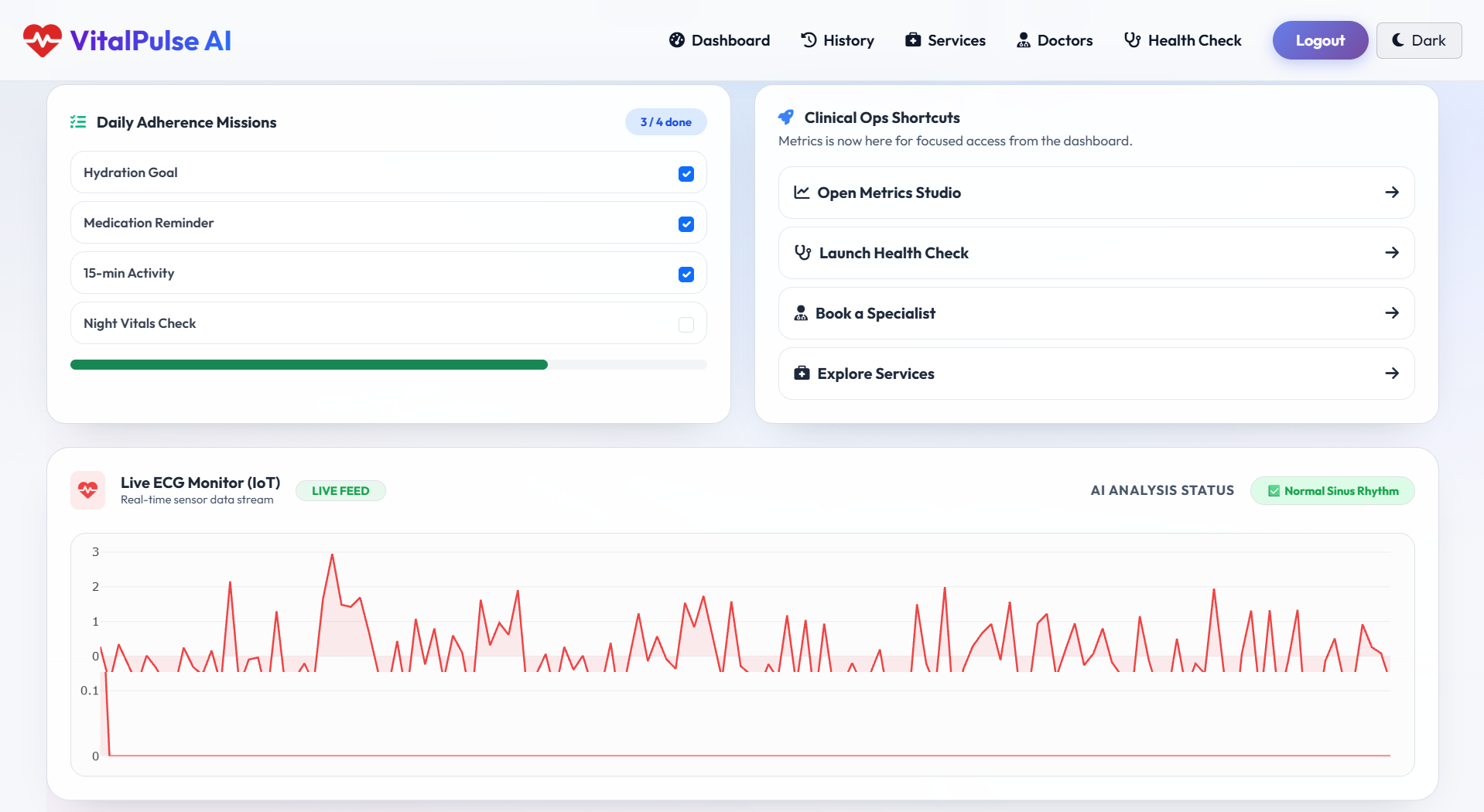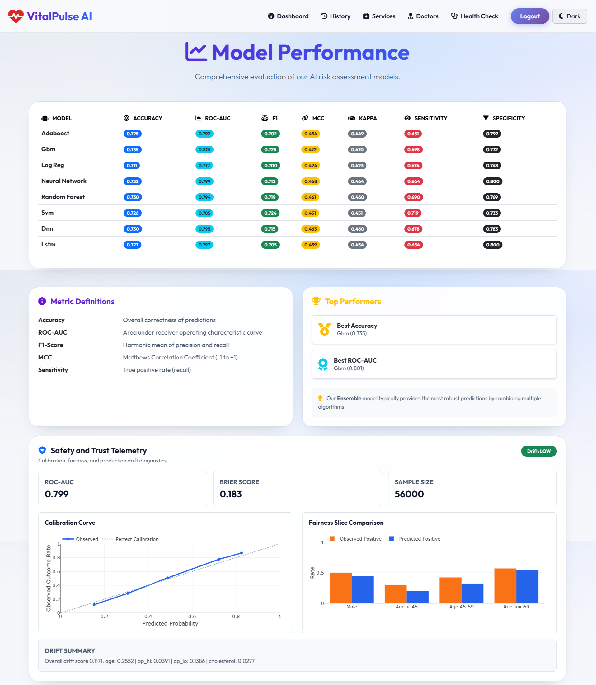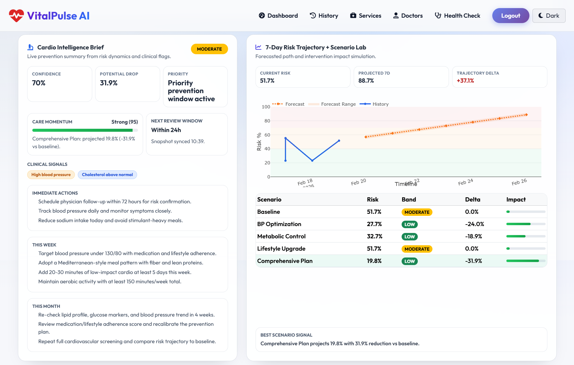 We built VitalPulse AI because we believed one well-designed, integrated intelligence platform could close that gap — not partially. Entirely. A platform that doesn't stop at prediction, but explains, forecasts, acts on, and monitors that prediction over time.
