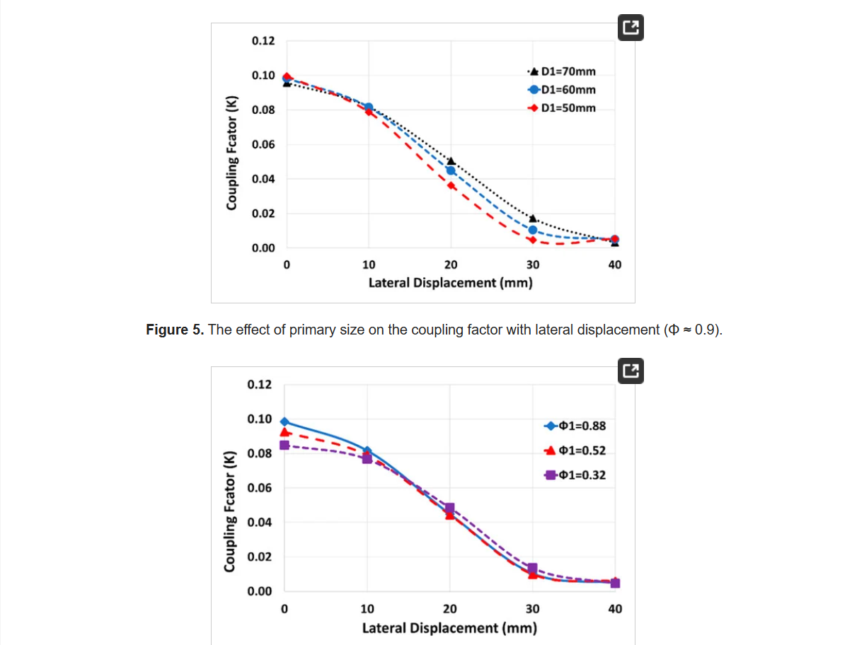 - The coupling factor between transmitter and receiver coils is critical for wireless power transfer.