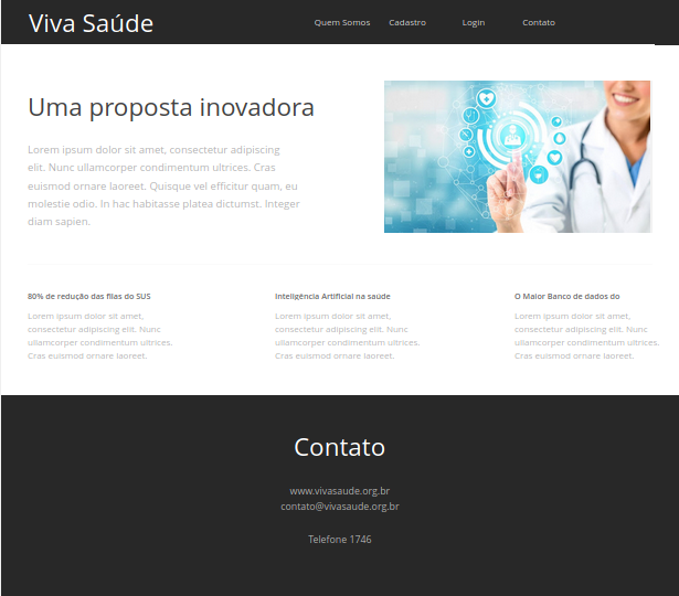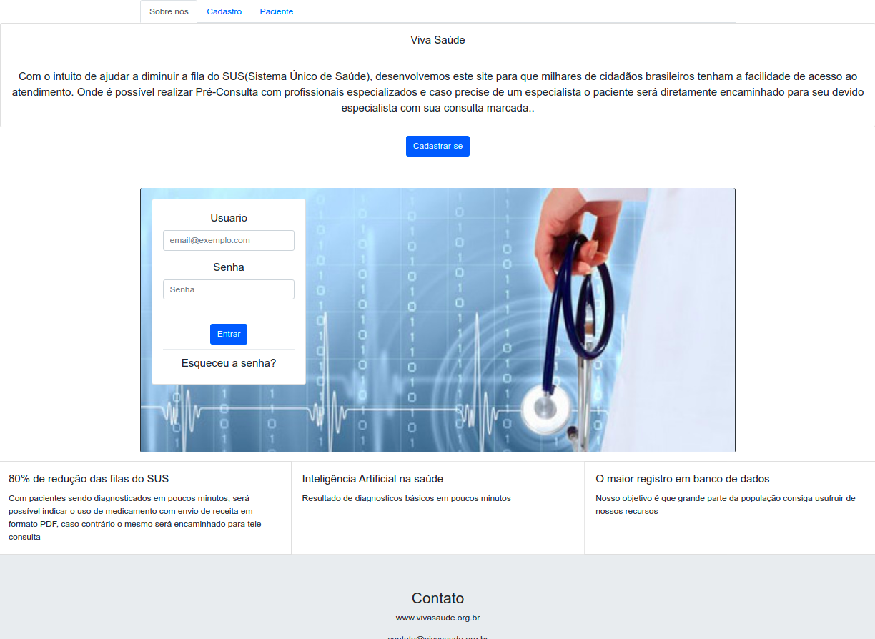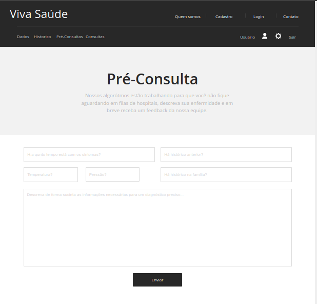 A proposta inicial é criar uma plataforma web para atendimento virtual, primeiramente o usuário faz seu cadastro para ter acesso a plataforma e através de um formulário específico submete seus sintomas para o sistema, a ocorrência é analisada e sendo um diagnóstico trivial o paciente recebe na própria plataforma um parecer médico e receita se for aplicável ao caso, e em casos mais precisos haverá um teleatendimento com o médico para avaliação mais minuciosa, e em último caso o paciente será encaminhado a unidade de saúde mais próxima de sua residência para situações mais específicas.