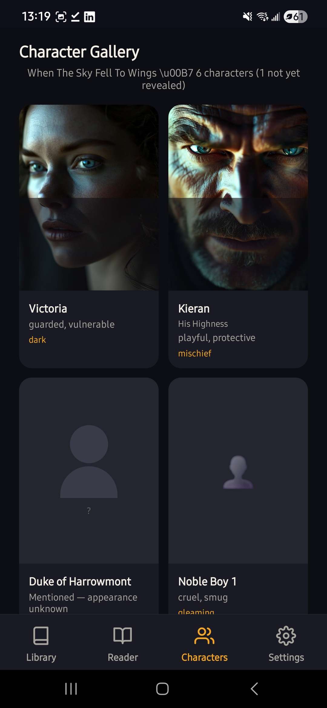 - Reveals characters progressively — the Characters tab reflects only who you've met so far, respecting spoilers