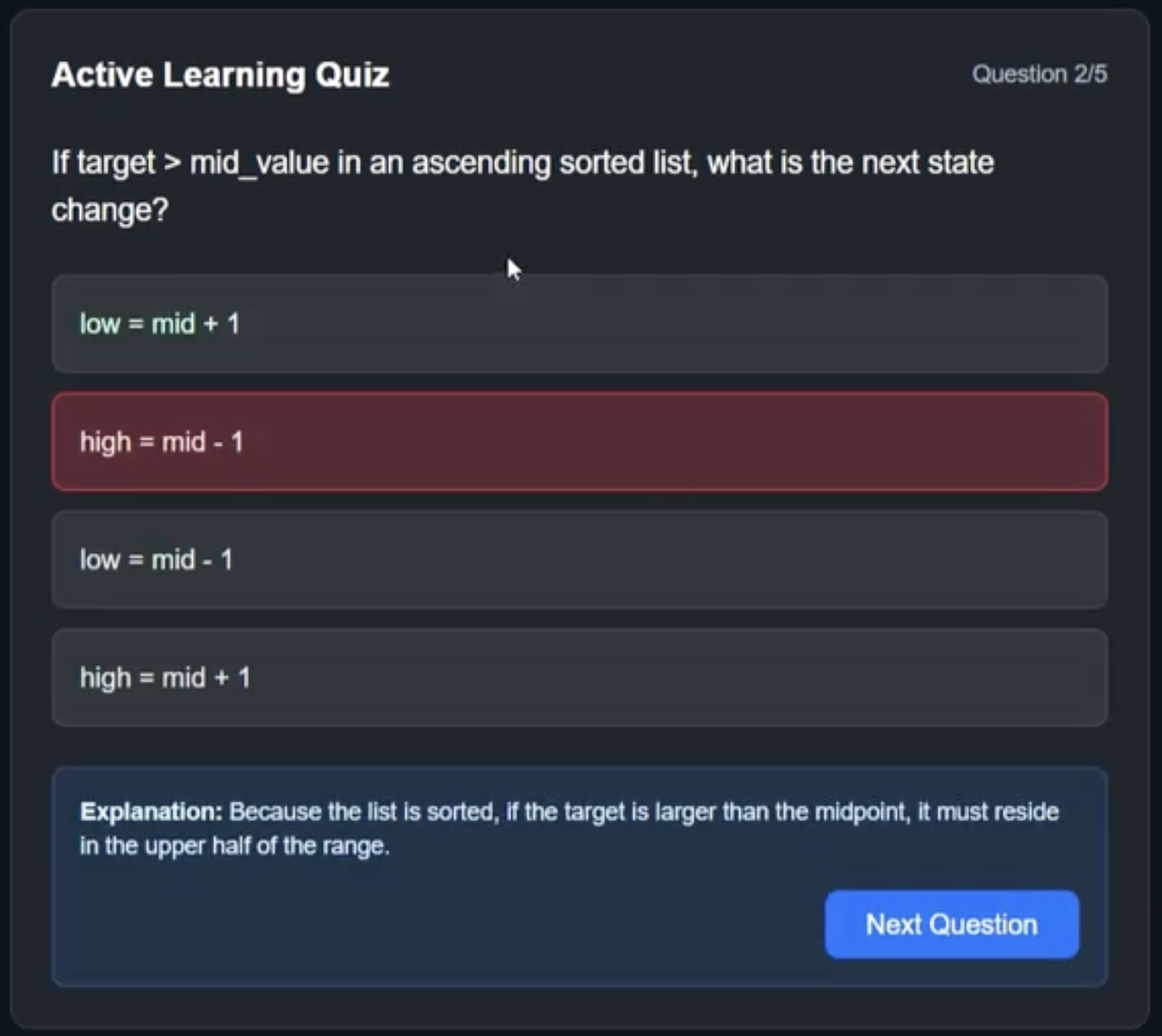 Finally, we realized how important active learning is—quizzes and coding challenges force users to engage with the concept rather than just observing it.
