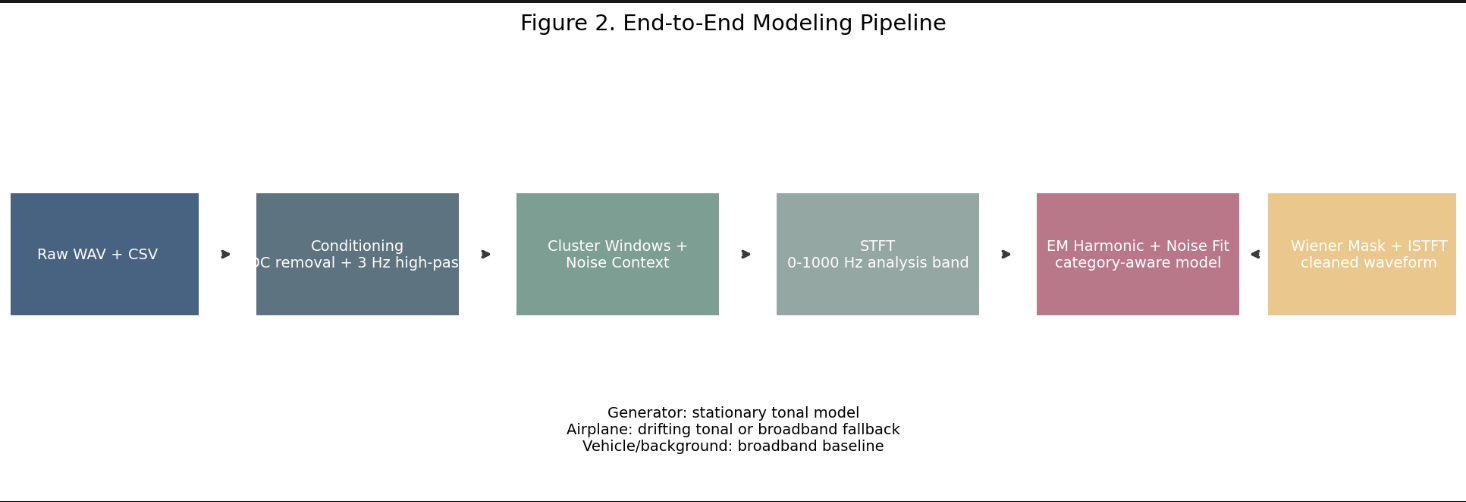 Our framing. We treat this as a parametric source separation problem, not denoising or classification. Off-the-shelf denoisers and pretrained source separators (Demucs, U-Net variants) fail here for three reasons: the dataset is too small for supervised training (200 rumbles, zero clean references), every pretrained audio model discards the sub-80 Hz band where rumble fundamentals live, and the integer-harmonic structure of rumbles is a hard mathematical fact we can encode directly as a prior — with no training examples needed.