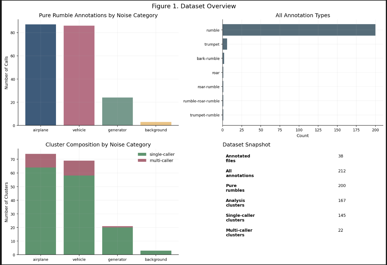 This figure summarizes the number of pure rumble calls by category, the overall annotation composition, and the split between single-caller and multi-caller clusters. It provides context for why a structured model is necessary and why overlap handling matters.