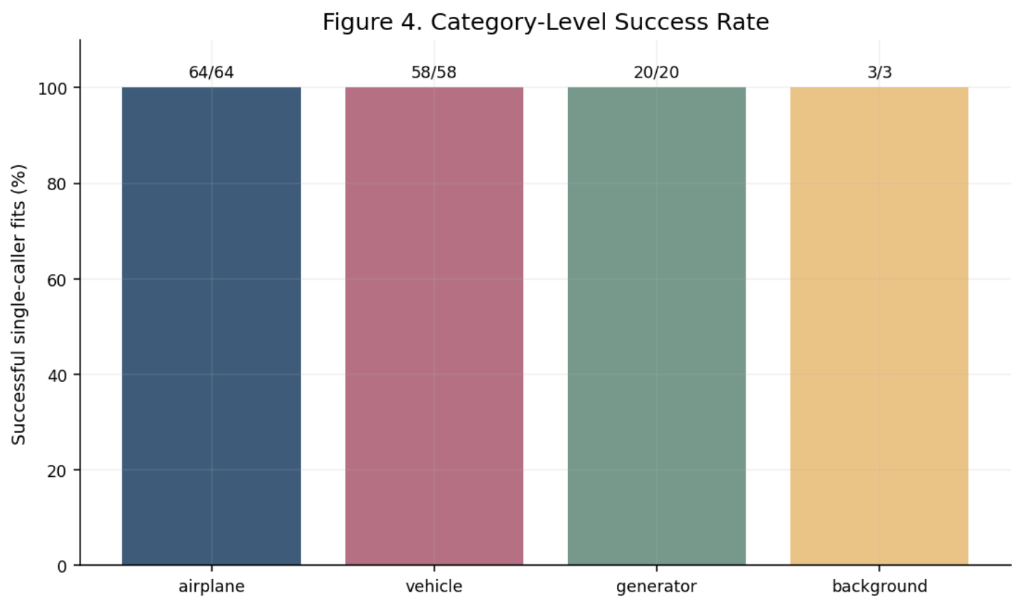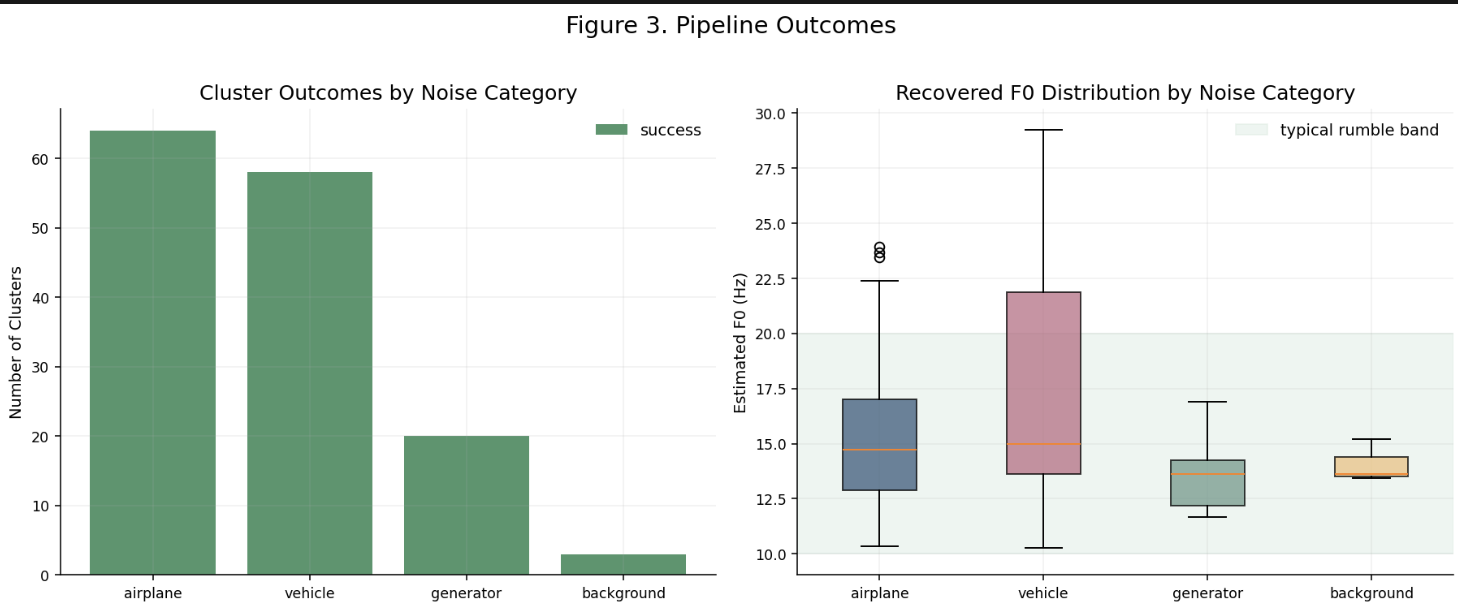 Result. All 200 rumbles in the dataset receive a processed output, with cleaned audio waveforms produced for every cluster. Multi-caller clusters (13% of the dataset) are handled via per-call independent fitting with explicit overlap-context flags.