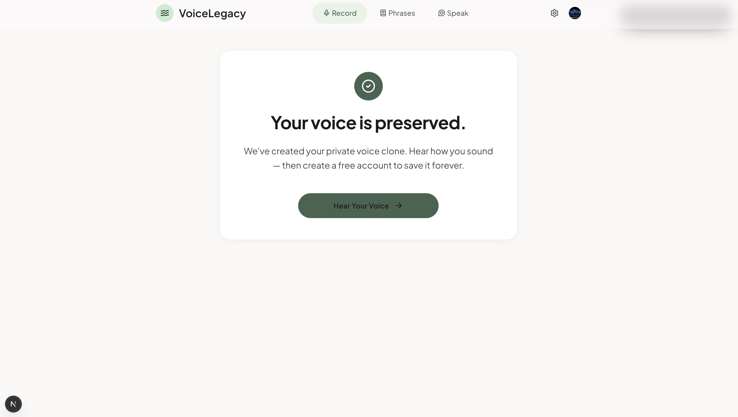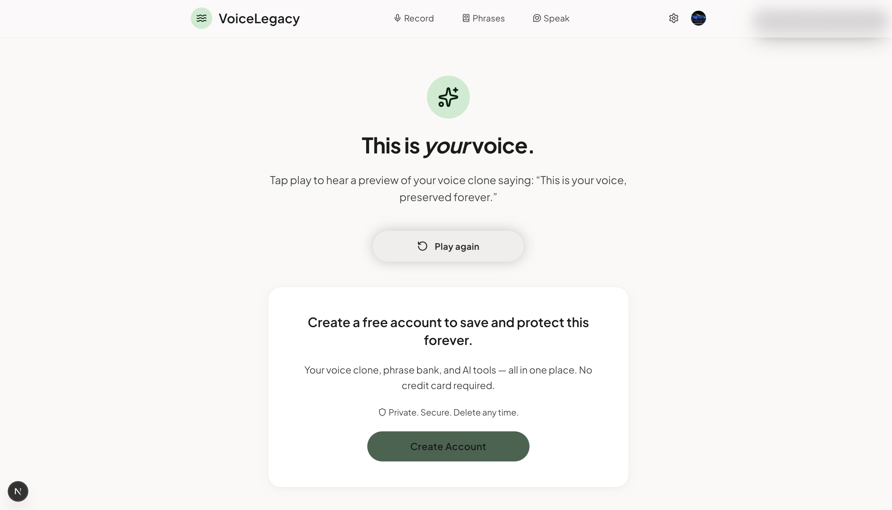 The most important product decision we made was the flow order. Users record their voice and hear their clone before we ask them to create an account. The emotional moment comes first. The ask comes after. That's not just UX — it's honesty about what the product is offering.