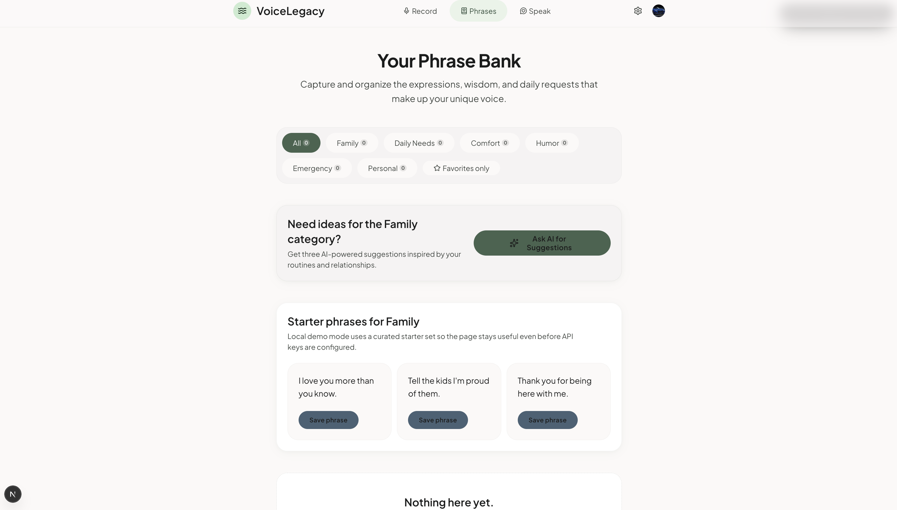 Users record a short guided session — about 2 minutes of natural speech — and VoiceLegacy creates a personalized voice profile. From there, they build a Legacy Phrase Bank: a private, categorized collection of the words, names, jokes, and expressions that make their communication feel like them. Family. Daily needs. Comfort phrases. Emergency phrases. Inside jokes.