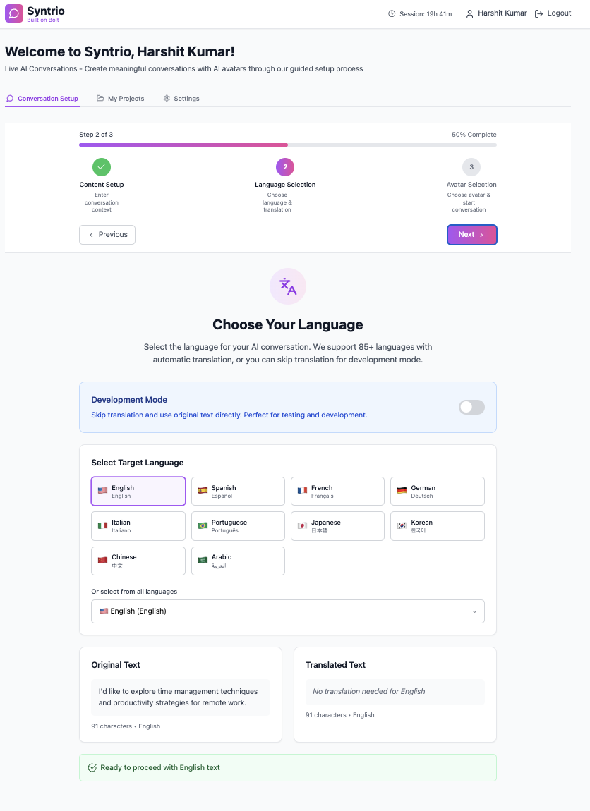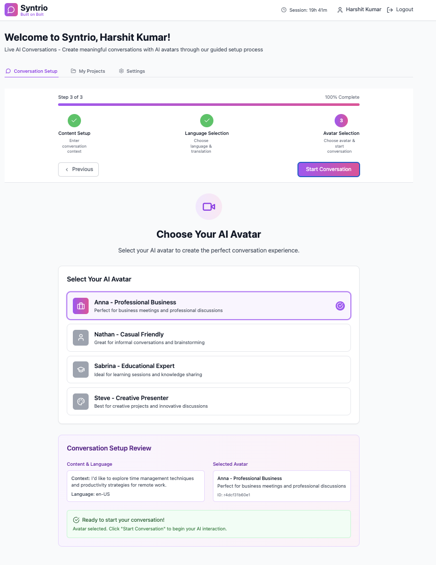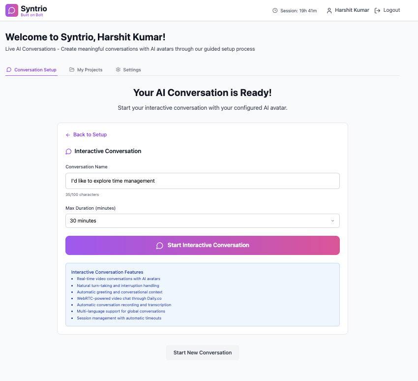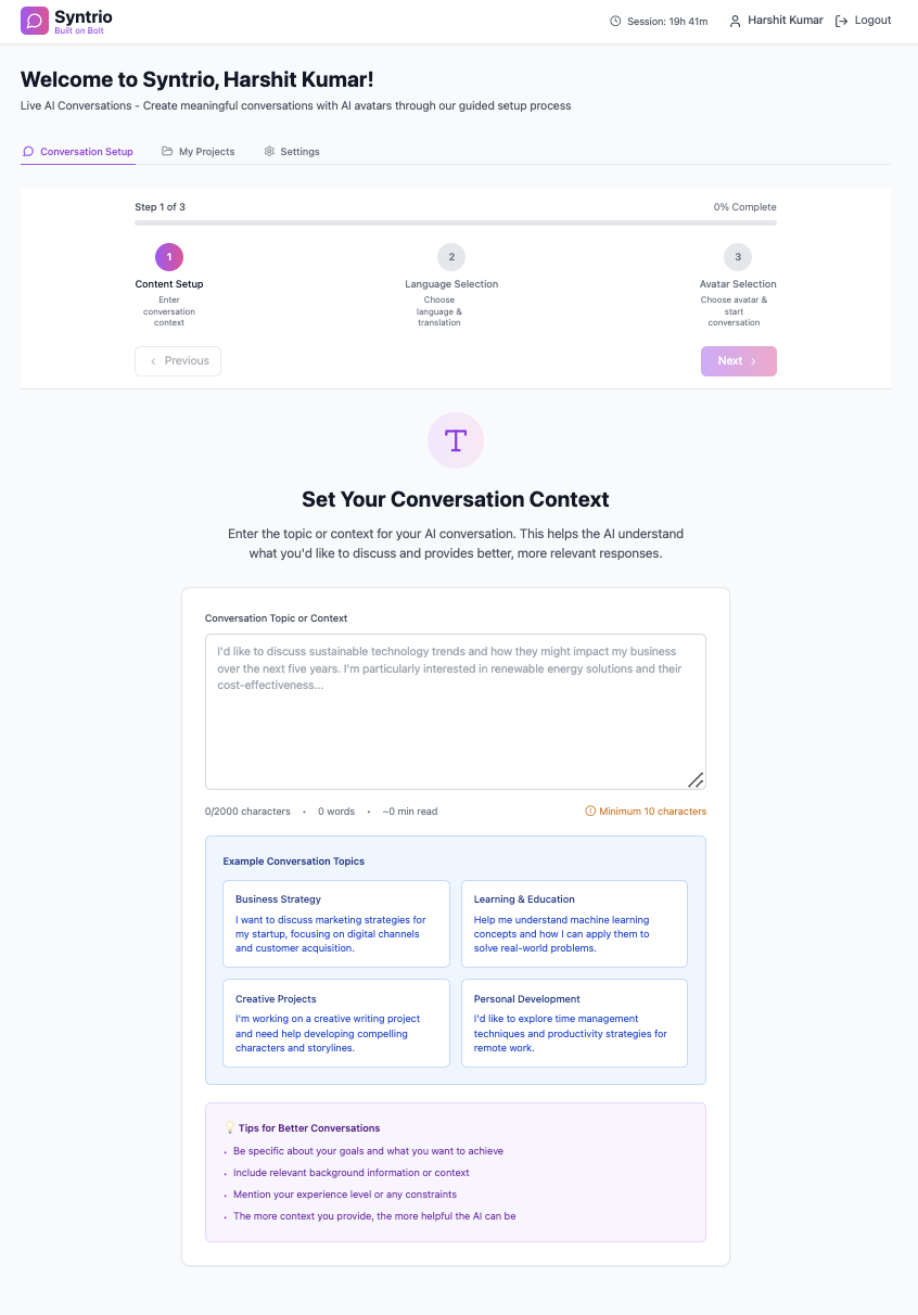 The challenge of creating engaging AI avatar conversations inspired us to build Syntrio. Most platforms require complex technical setup and multiple tools, creating barriers for users who want to experience live AI interactions. We envisioned a simple, intuitive solution that could democratize access to AI avatar technology.