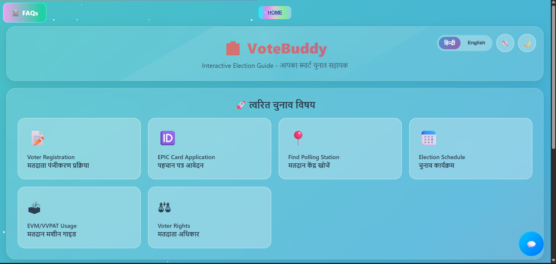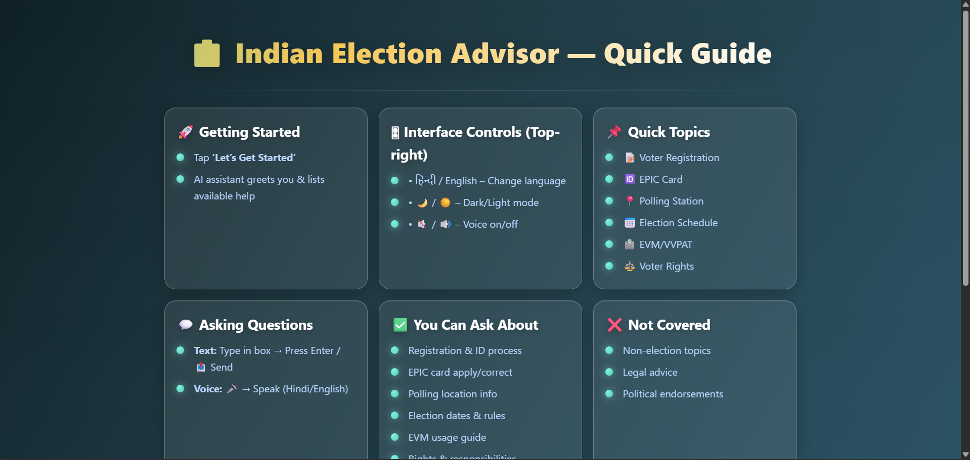 VoteBuddy is a multilingual AI election assistant that helps users: