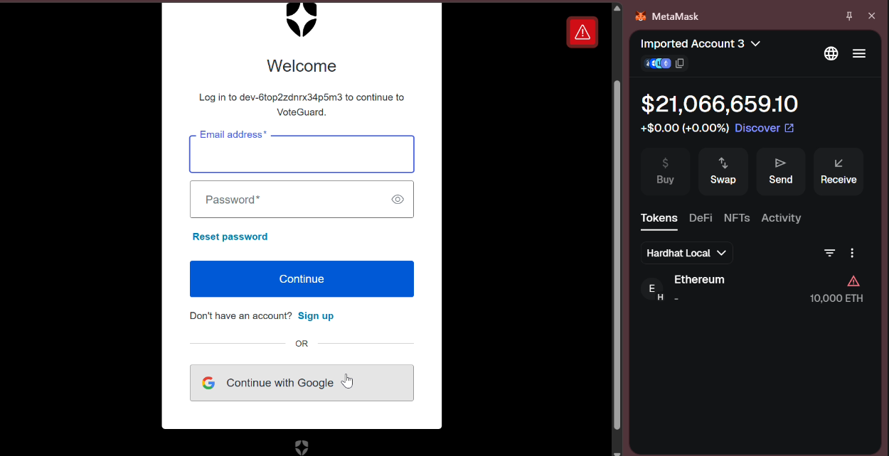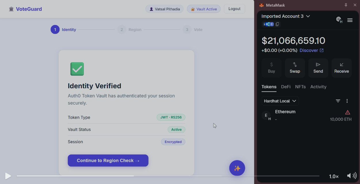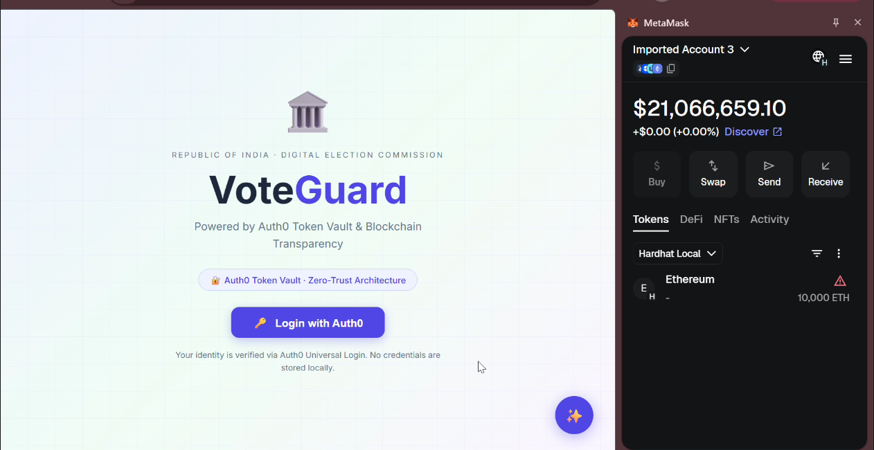 VoteGuard is a revolutionary blockchain-powered digital voting platform designed to restore trust in democratic elections through transparency, security, and accessibility. By combining Auth0's zero-trust token vault architecture with blockchain technology, VoteGuard creates an immutable, verifiable, and user-friendly voting experience that eliminates fraud concerns while maintaining voter privacy.