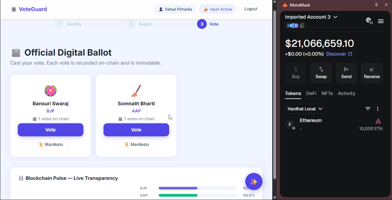 - Vote Confirmation → Vote recorded on-chain, displayed in Blockchain Pulse