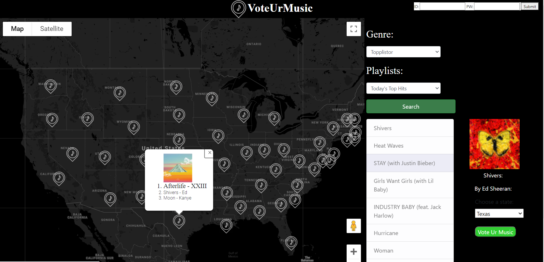 What is your favorite music? What music do your friends like? What musics are in your neighbor's playlist? Normally, we listen to music while we are going to school, studying for the exam, doing homework, and playing games. Sometimes we want to know other people's music tastes to know the trends these days or to know their preference. We came up with our project "VoteUrMusic" to let yall can see which song is most heard in your state.