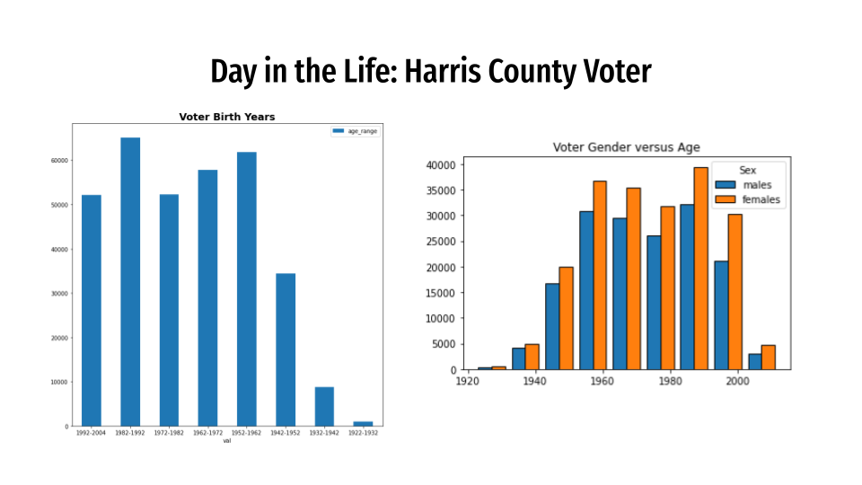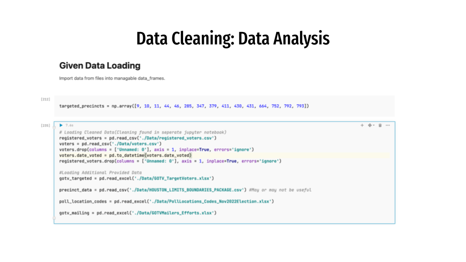 Our data analysis was done in a Juypter Notebook file. Using the data provided by Baker Ripley and web scraping for more data from voter websites, we used tools like python Pandas and Numpy to analyze and create a story about the 2022 election in Harris County.