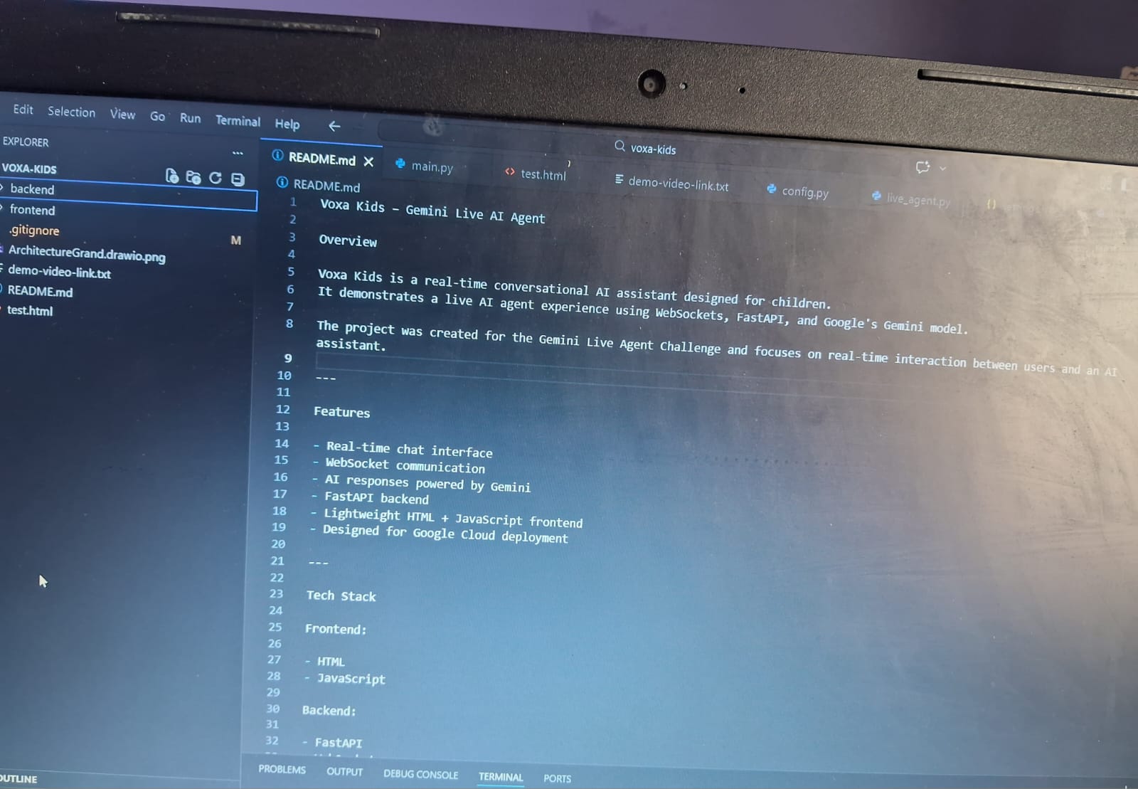 We used a combination of Python for the backend, a web-based frontend with HTML/CSS/JS, and integrated AI models via VoxaKids Gemini API for vision and language understanding. The backend handles data processing, and the frontend provides an interactive interface for kids.
