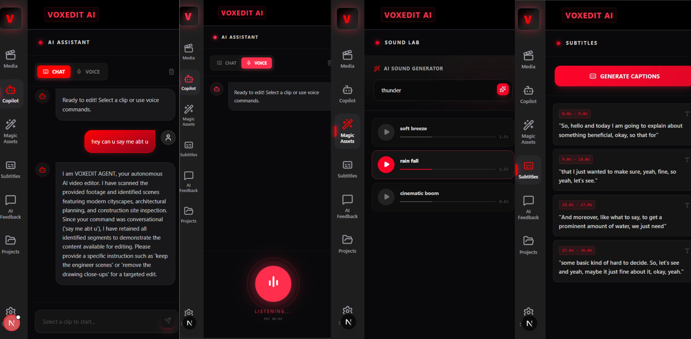 VoxEdit automatically generates subtitles and sound effects synchronized with the video using AI-generated assets.Transparent AI Reasoning