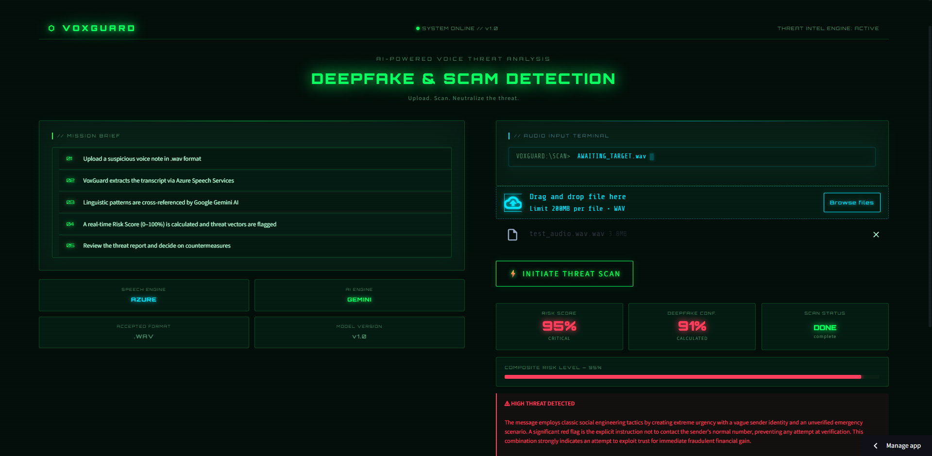 VoxGuard is a dual-engine security dashboard that analyzes suspicious voice notes for both synthetic cloning and psychological manipulation. It takes a raw audio file, extracts a precise transcript using Azure Speech Services, and then feeds that data into Google Gemini 2.5 Flash. The system provides a real-time Risk Score (0-100%), flags linguistic red flags (like isolation tactics or financial urgency), and gives the user an actionable threat report.