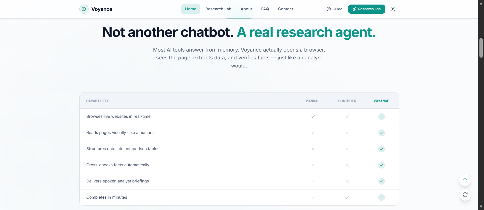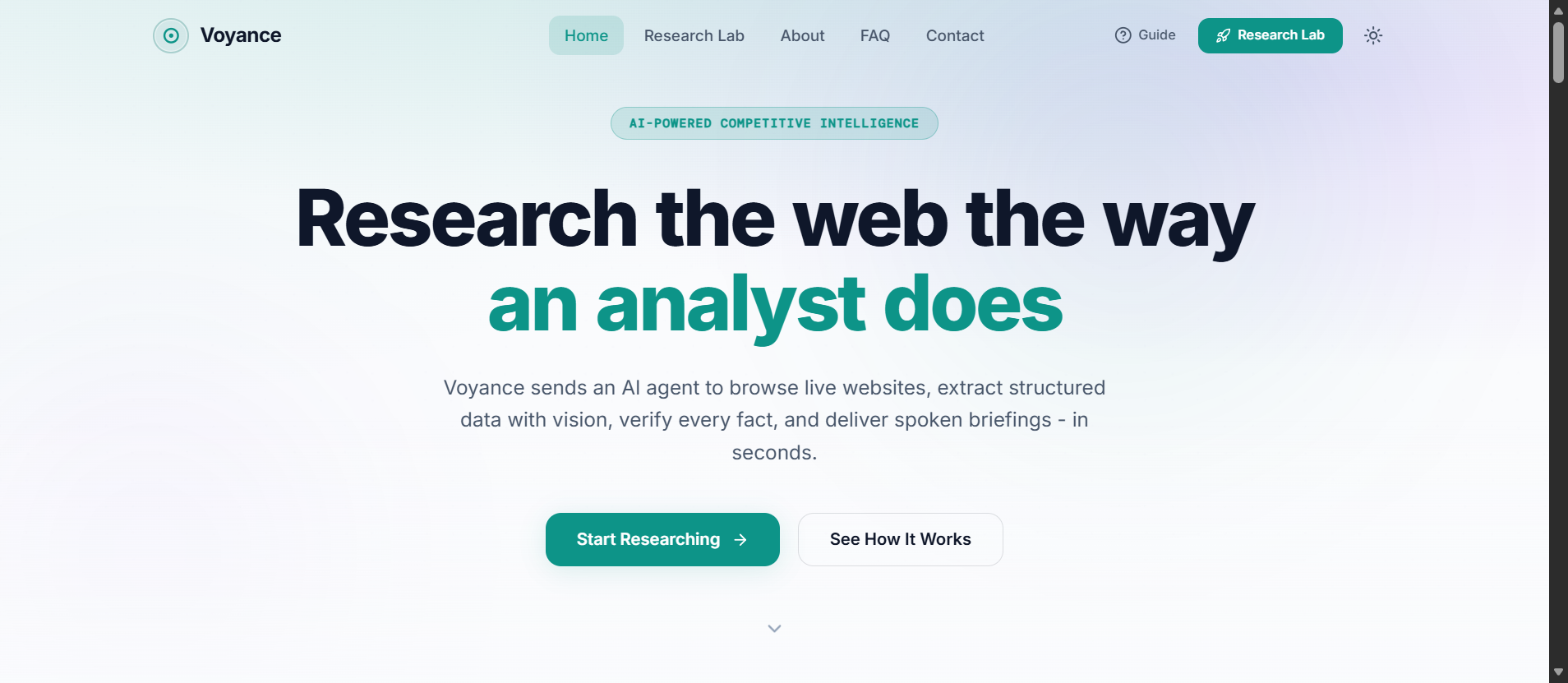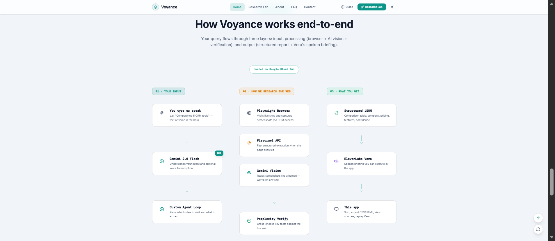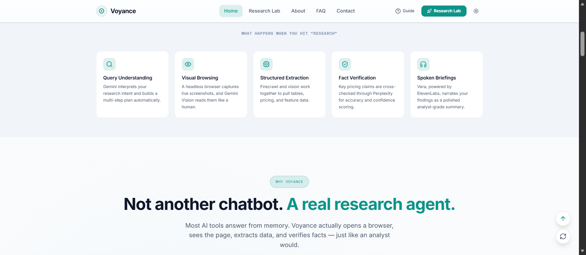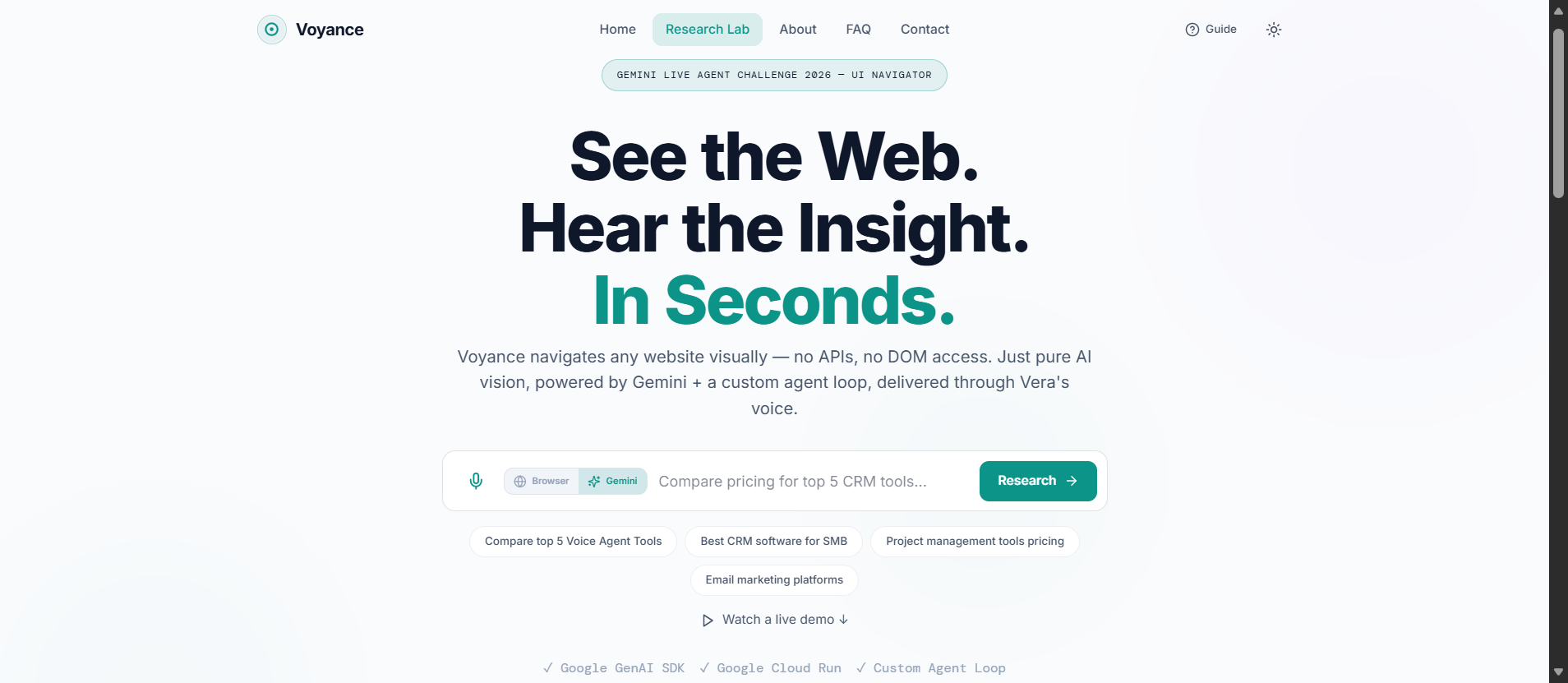 Instead of fighting DOM structures, Voyance uses computer vision + multi-model planning to browse like a real analyst — and was built specifically for the Gemini Live Agent Challenge (UI Navigator track), which asks: Can an agent observe and interact with interfaces using multimodal vision?