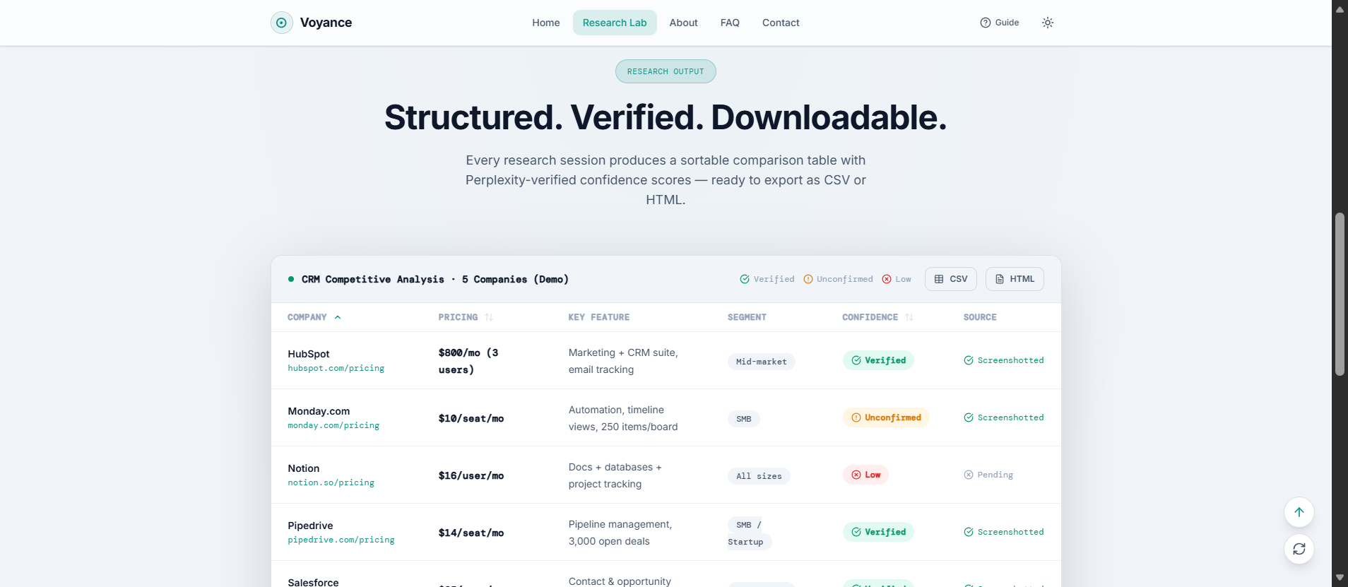 - 📊 Sortable comparison table — company, segment, pricing tiers, key features, and confidence badges