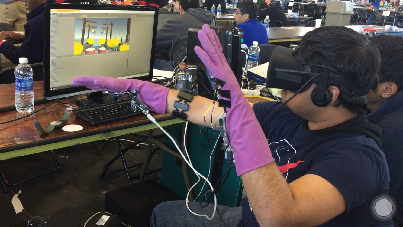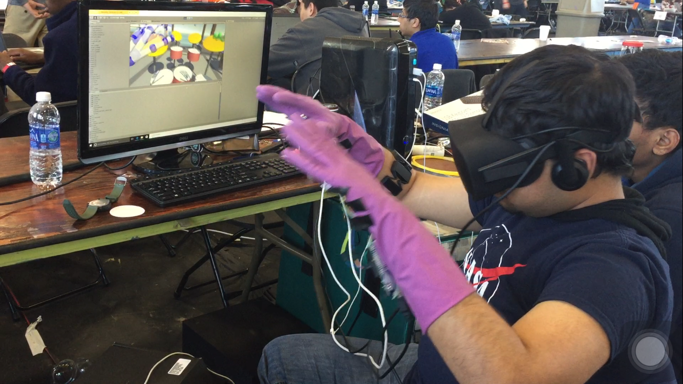 We used the Unity platform to create a virtual environment along with the instruments which can be visualized using the Oculus Rift. The instruments are interacted via a Leap Motion Sensor which recognizes the users hand gestures and imitates them accurately on the virtual platform. Contact surfaces were detected within the Unity platform between the virtual user and the virtual instruments. To make the experience more life like, we introduced Haptic Feedback via a wearable hand glove device, which vibrates upon contact with the instrument. MYO armband was incorporated for arm gesture detection which was then used in manipulating the environment(sound).