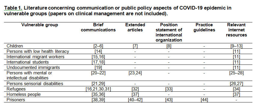 Vulnerable social groups were defined as children, persons with low health literacy, international migrant workers, international students, persons in assisted living and nursing homes, persons with intellectual or sensorial disabilities, refugees, undocumented migrants, homeless people, prisoners.[1] Only public health management and communication, but not clinical aspects of management were summarized.