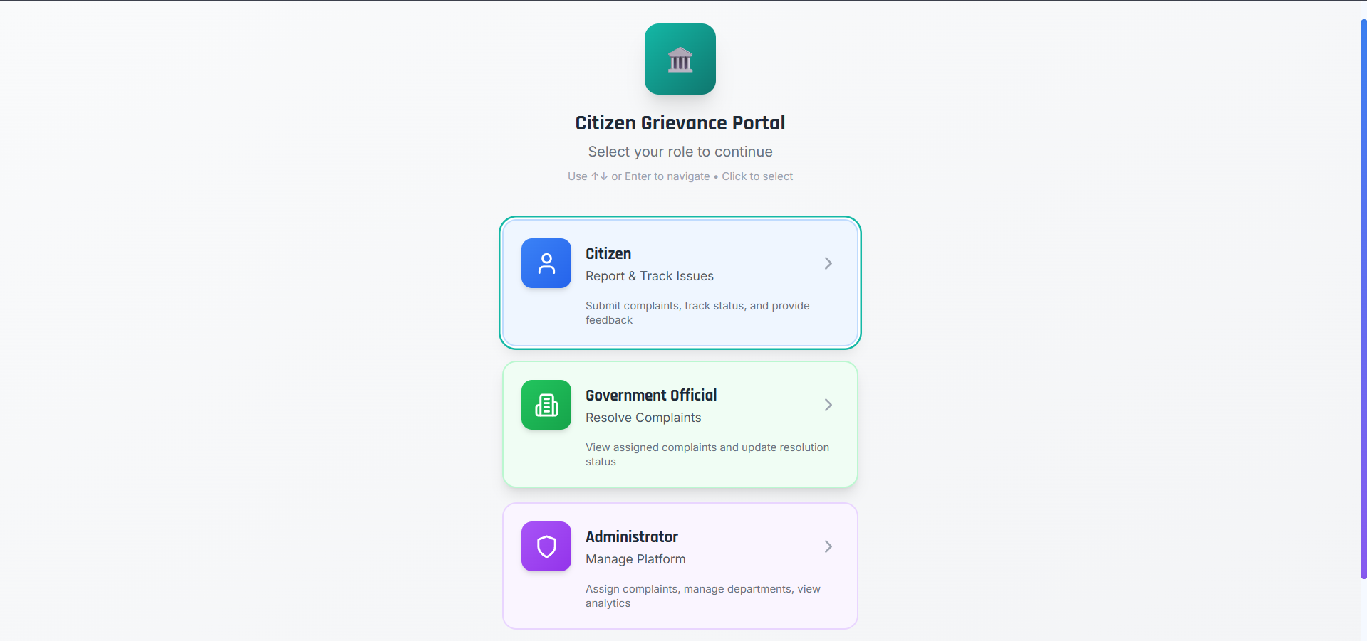 - Track complaint journey: Submitted → Assigned → In Progress → Resolved