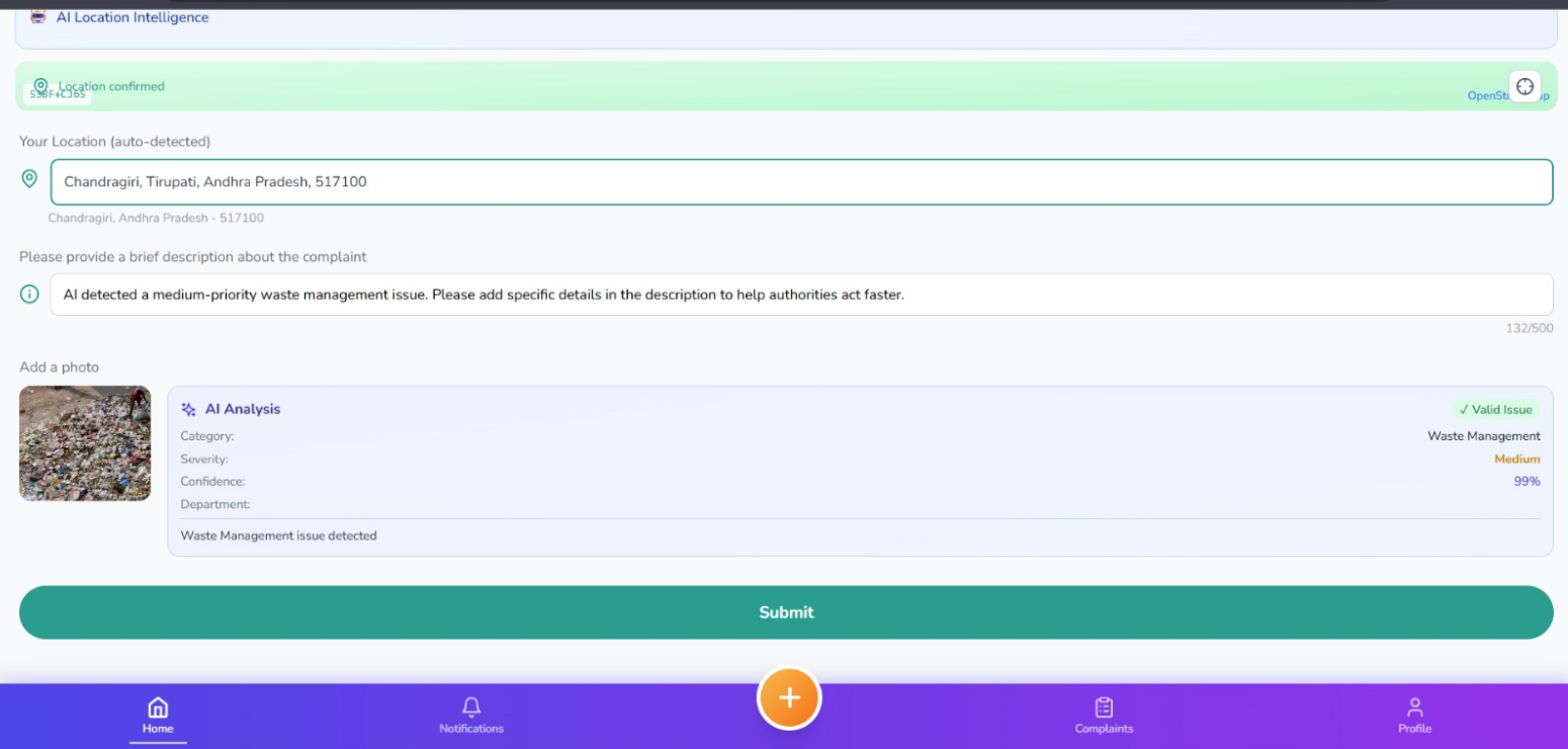 - Detects category: Road, Water, Electricity, Sanitation, Public Safety