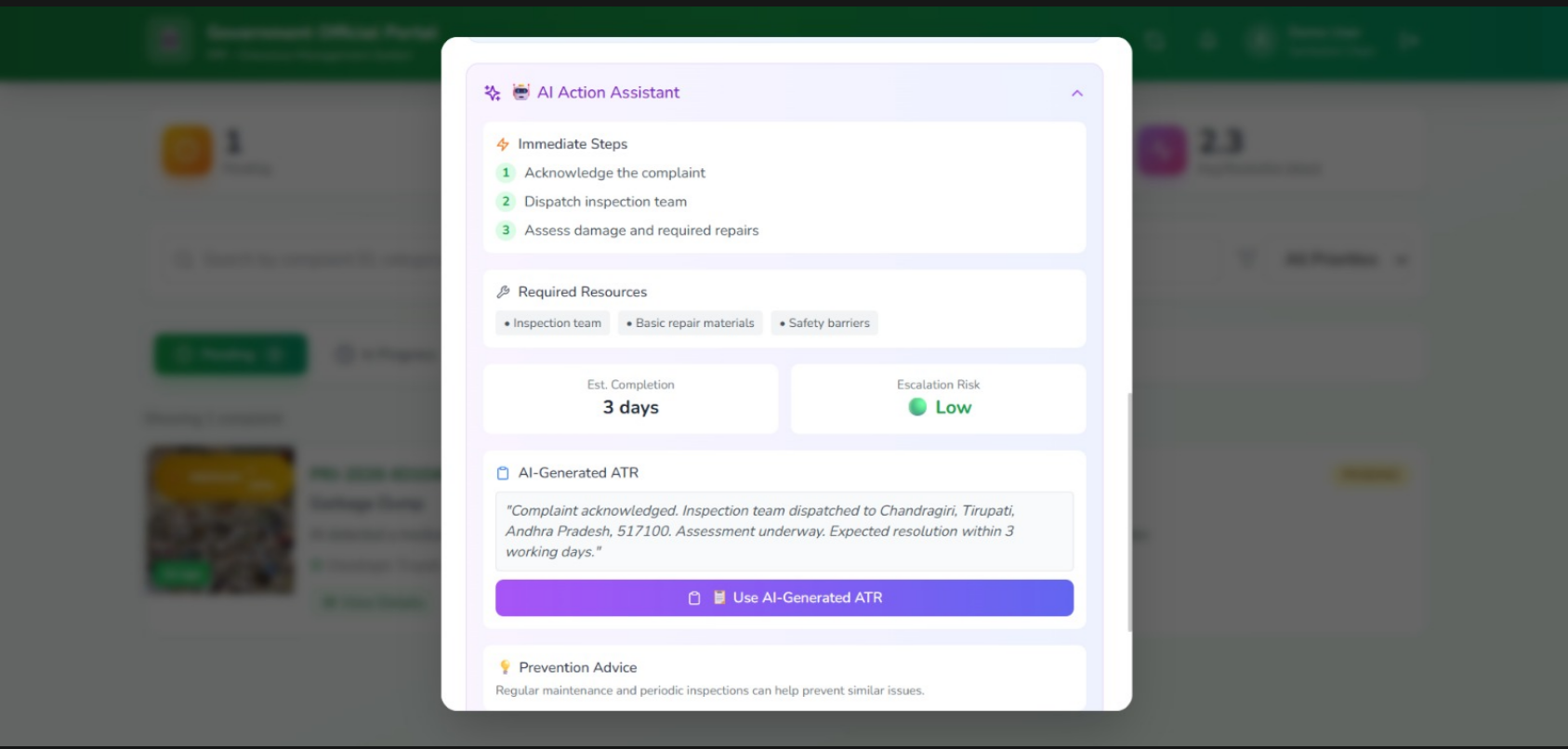 - AI generates professional ATR (Action Taken Report) instantly