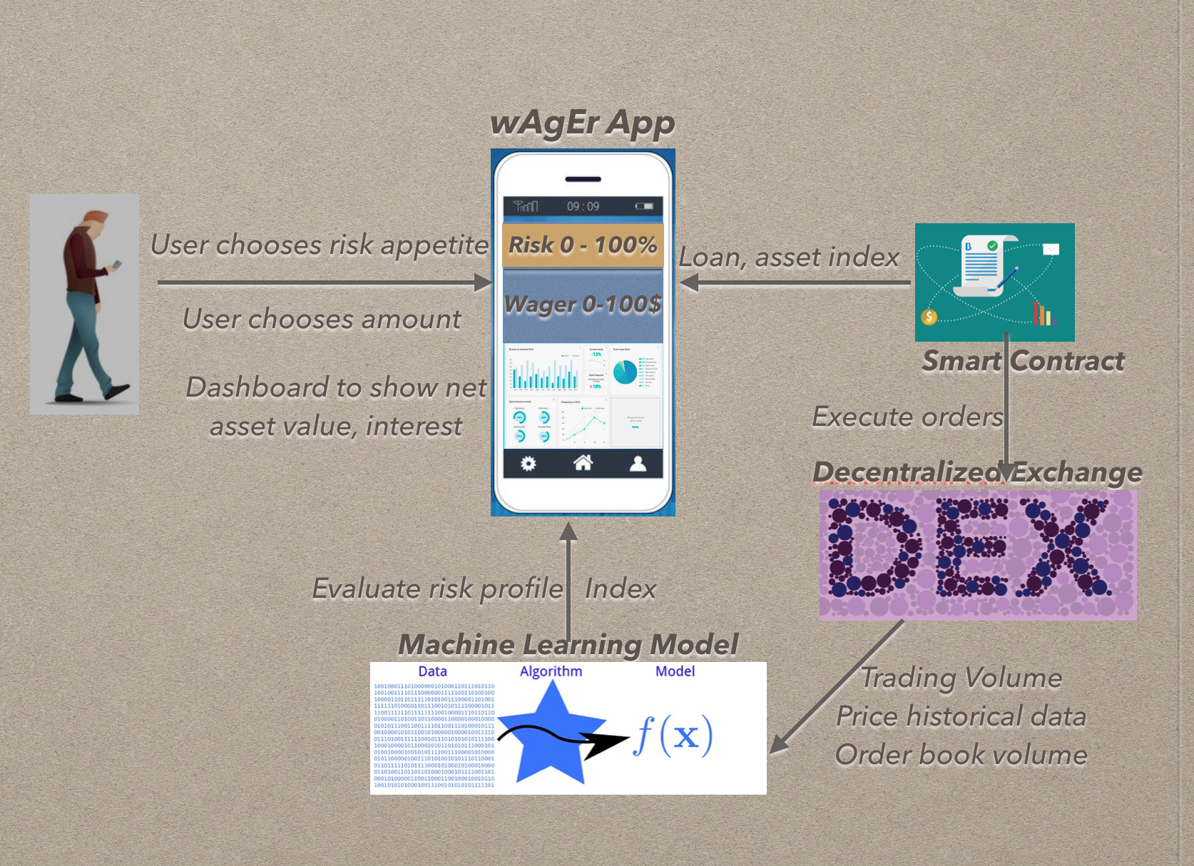 The inspiration for wager comes from the need to redefine investment as a "loan". --> Investors face opaqueness of risk profile in traditional investment funds. --> Absence of a crypto benchmark fund like S&P to spawn crypto ETFs. --> Friction for non-crypto users from using this a vehicle as a method for lending, investment and participation in smart contract ecosystem. --> Most of the blockchain projects are not mobile first, and do not make use of the power of statistical ML models. We aim to disrupt this conventional centralised ETF with a new concept which will flip investment into a loan and benefit the governance council and its participants. With ML models, smart contracts and user input this will be truly decentralised yet personalised trading/investing/lending platform.
