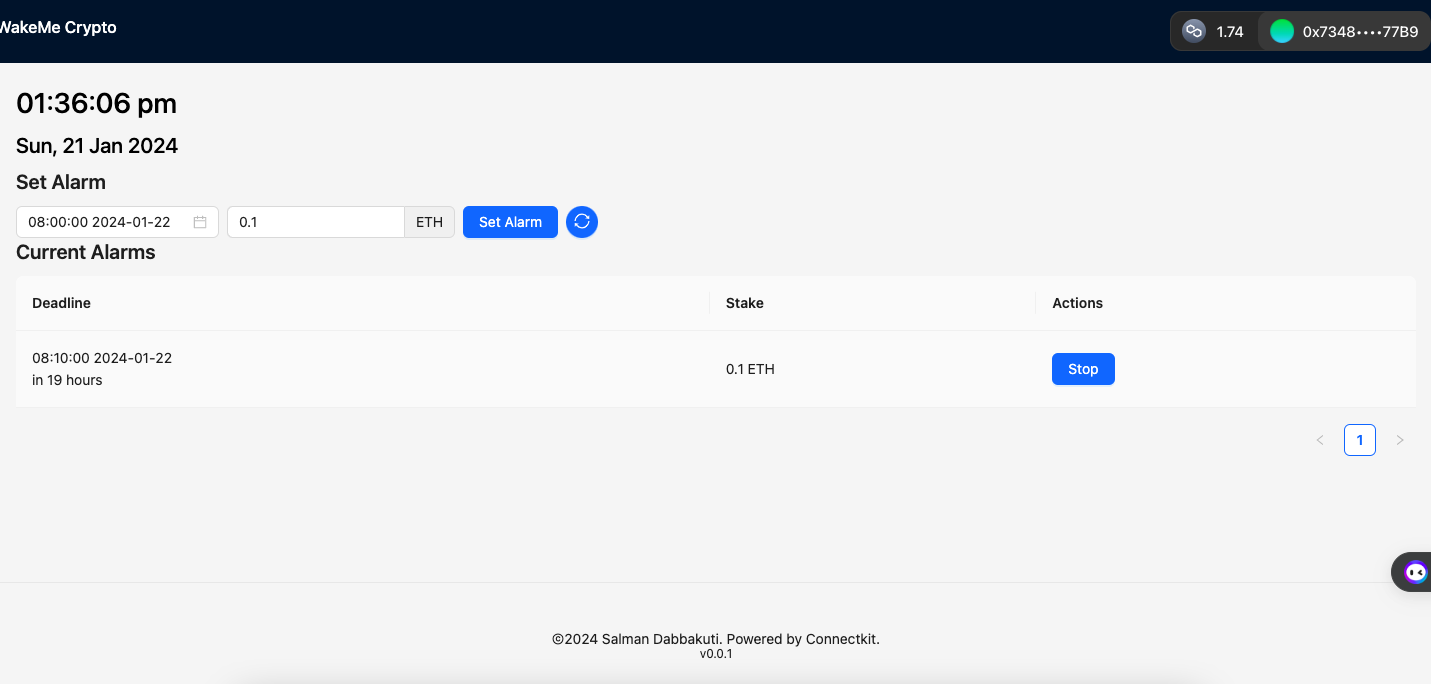 We built WakeMeCrypto using a tech stack comprising Solidity for smart contracts, Next.js for frontend development, and Web3.js for blockchain integration. ConnectKit enables seamless wallet management, while the Web Notification API ensures timely alerts for wake-up notifications.