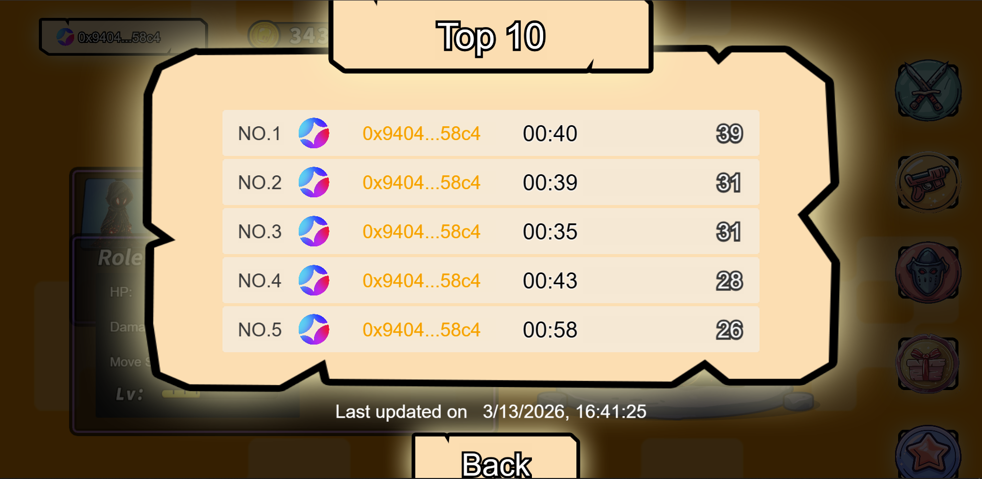 2.4 Onchain ranking page Here you can see the player ranking data, and you can see kills and time of each item. At the bottom you can view the update time of the current chain's ranking. This ranking list can be scrolled up and down, and currently stores the top ten data of rankings.