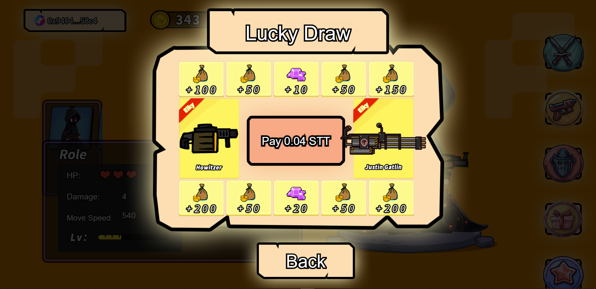 2.3 Lottery Page Players need to pay 0.04 STT to participate in the lottery, and can draw gold coins, diamonds and advanced weapons. A VRF random extraction function is implemented to ensure the fairness and randomness of the lottery. If you want to experience the Howitzer and Gatling as soon as possible, please come and participate in our lucky draw!