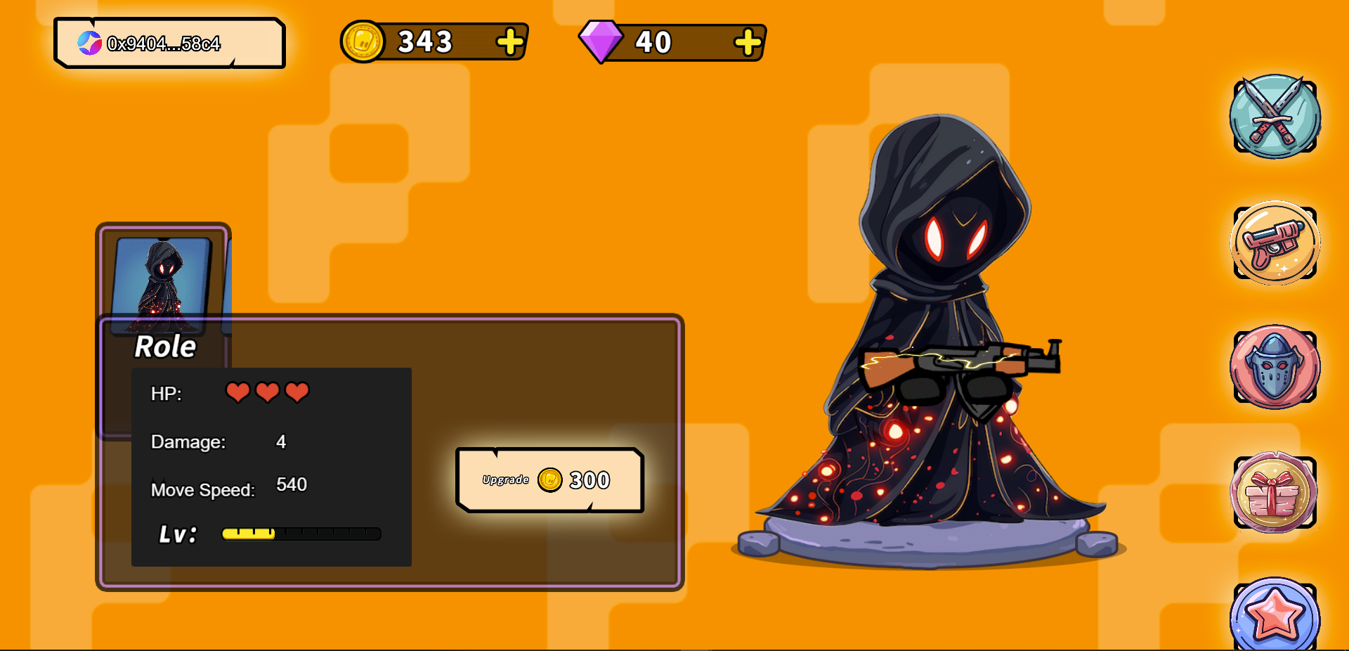 2、Home Scene On the homepage, you can see various game data, such as the number of gold coins and diamonds, network icon, wallet address, etc., as well as game characters and weapons, and of course the scrolling background and LOGO I drew specifically for Somnia Testnet. The five buttons on the right have different functions: Home, Weapons, Characters, Lottery, and Onchain Rankings. Click the Start Game button, you need to pay 0.01 STT for the gas token, then wait for a moment and enter the game after the transaction is completed. When you start the game, you need to pay 0.01 STT as the ticket fee to participate in the game, and this fee will be directly distributed to outstanding players in the current ranking as a game incentive. (If you can maintain a high ranking, it means you can earn a huge amount of STT tokens) Alt text