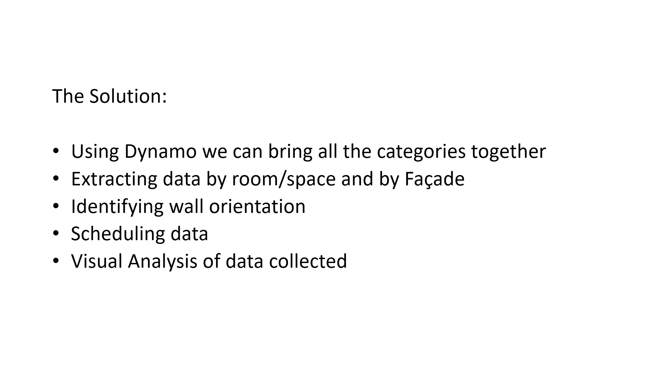 *Isolating exterior wall and room/space *Gathering windows associated with the room/space *Isolating faces of walls and room/space *Resolving area of exterior facing of room/space *Integrating area of windows to calculating percentage *Analyzing data
