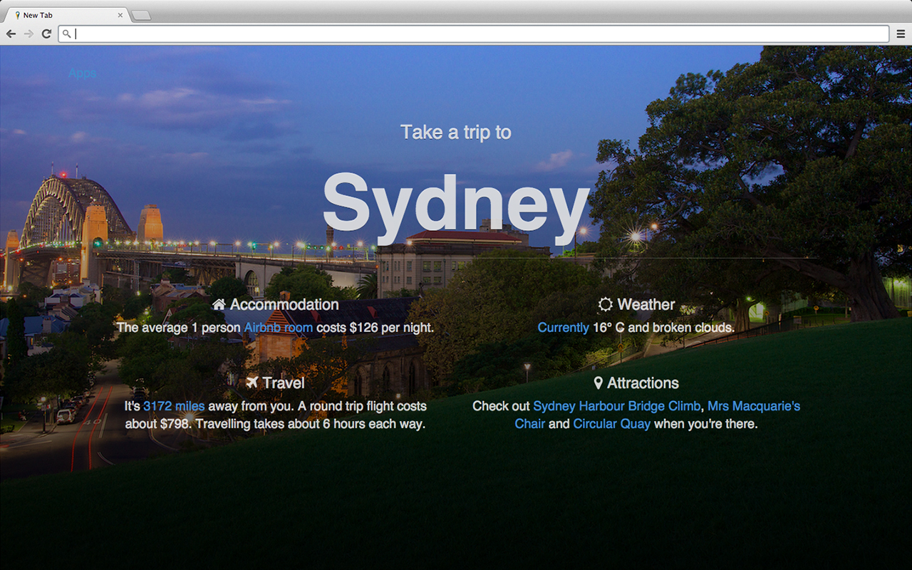 We pull in beautiful high-resolution photography of the destination, and a selection of the most important information about it: weather, travel, accommodation and attractions.
