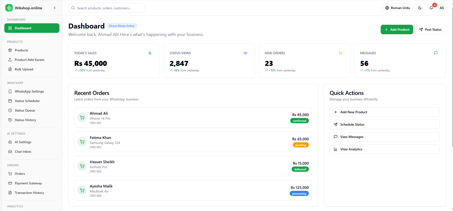 AI Sales Agent: Instantly replies to queries in Roman Urdu/English and guides users to checkout. Status Automation: Automatically posts new products to WhatsApp Status for organic marketing. Unified Dashboard: Manages orders, sales, and analytics in one clean interface. Local Payments: Built-in verification for Easypaisa, JazzCash, and bank transfers. How we built it We used the MERN Stack (MongoDB, Express, React, Node) for performance: