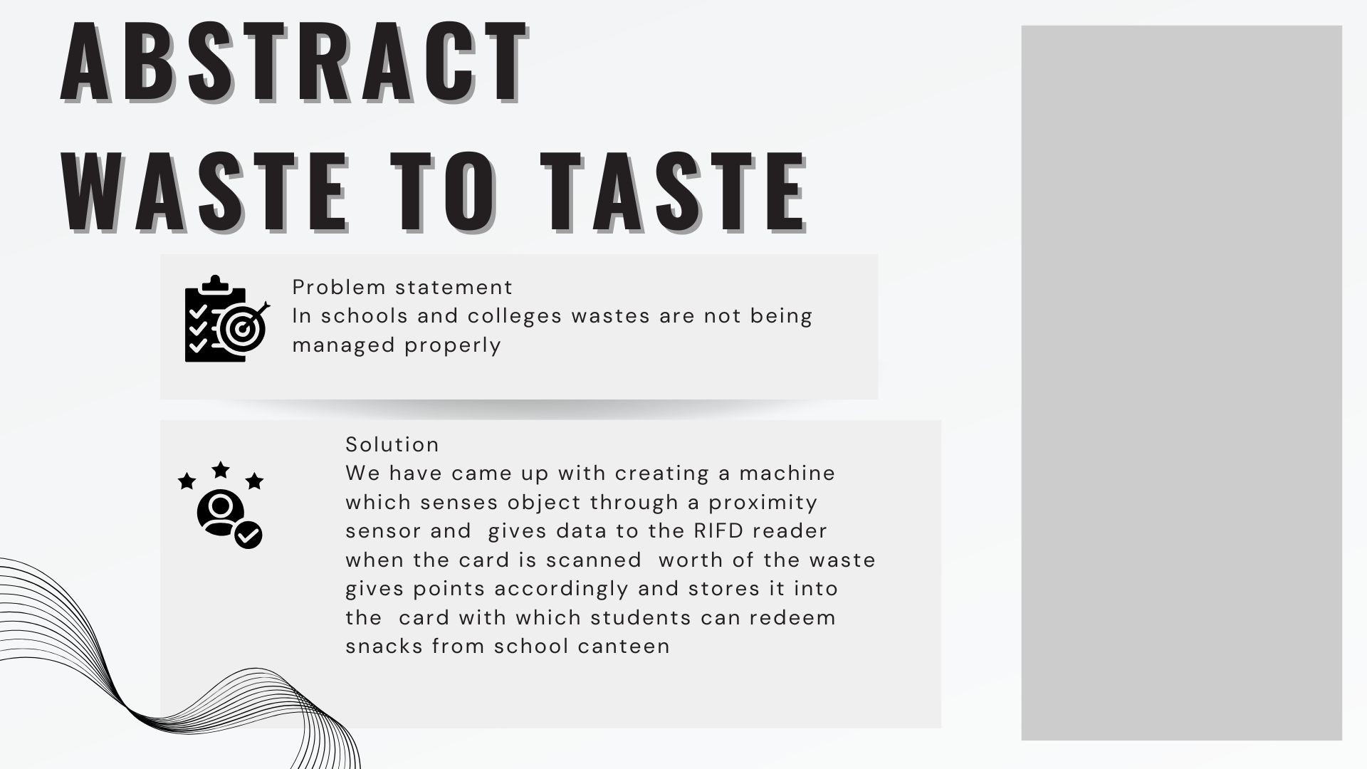 Our team saw the problems faced by students staff and the cleaners in the school that irresponsible students do not dispose waste in a proper manner son we came up with an idea of creating dustbin which senses the waste and gives points according to it which allots points inside a card which the points will be stored which can be used for redeeming snacks in the school canteen so that the students will get intreseted in dumping waste inside the dustbin properly