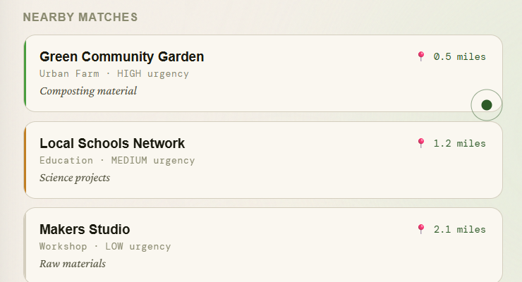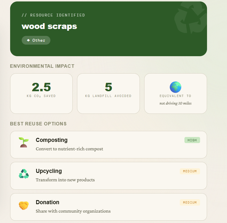We wanted to create a platform that helps reduce waste by connecting people and businesses with nearby reuse options upcycling opportunities. The goal is to make it easy to divert waste from landfills while supporting local communities. We were inspired by the Too Good to Go app for food waste!