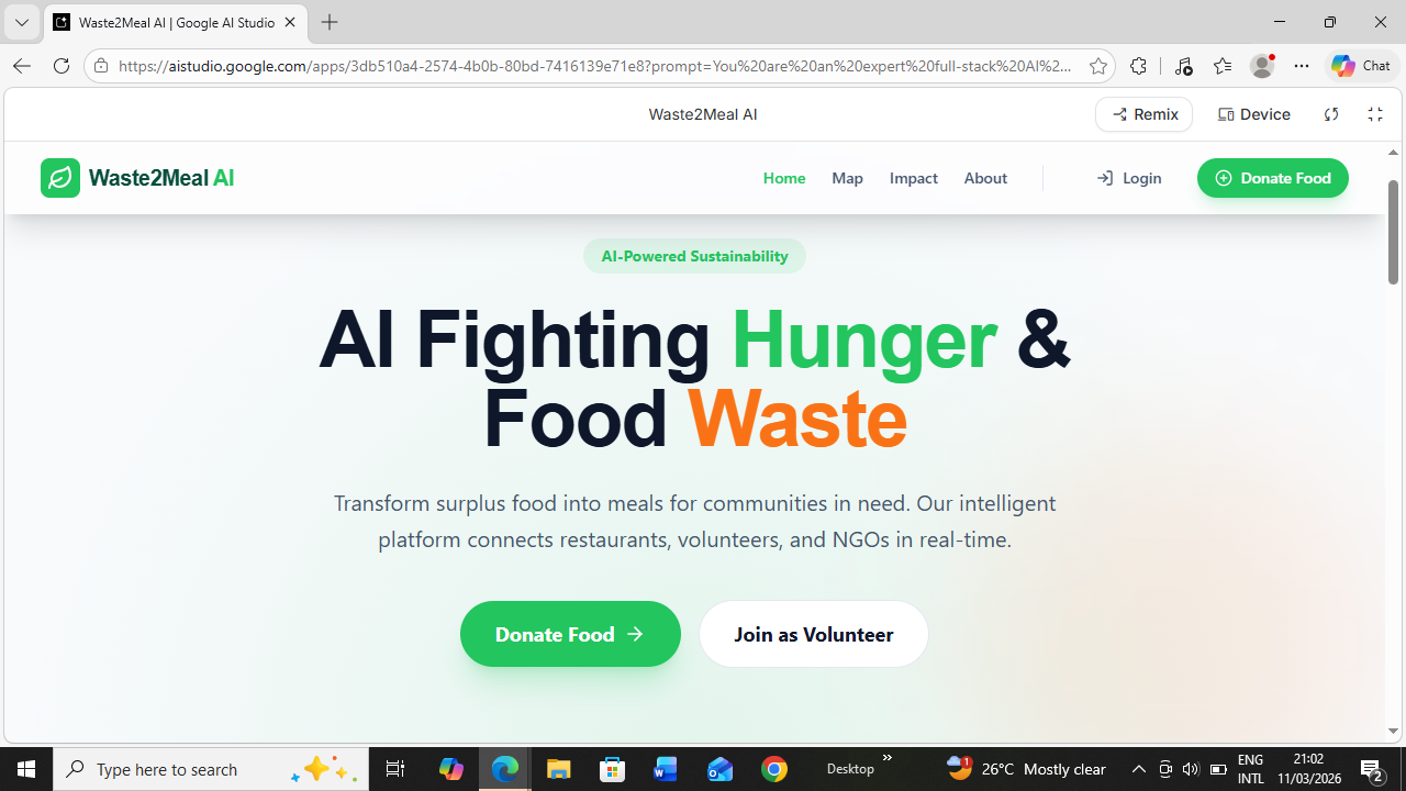 We were inspired to build Waste2Meal AI to bridge this gap. Our goal is to use artificial intelligence to predict surplus food, connect food donors with nearby shelters, and ensure that good food reaches people instead of landfills.