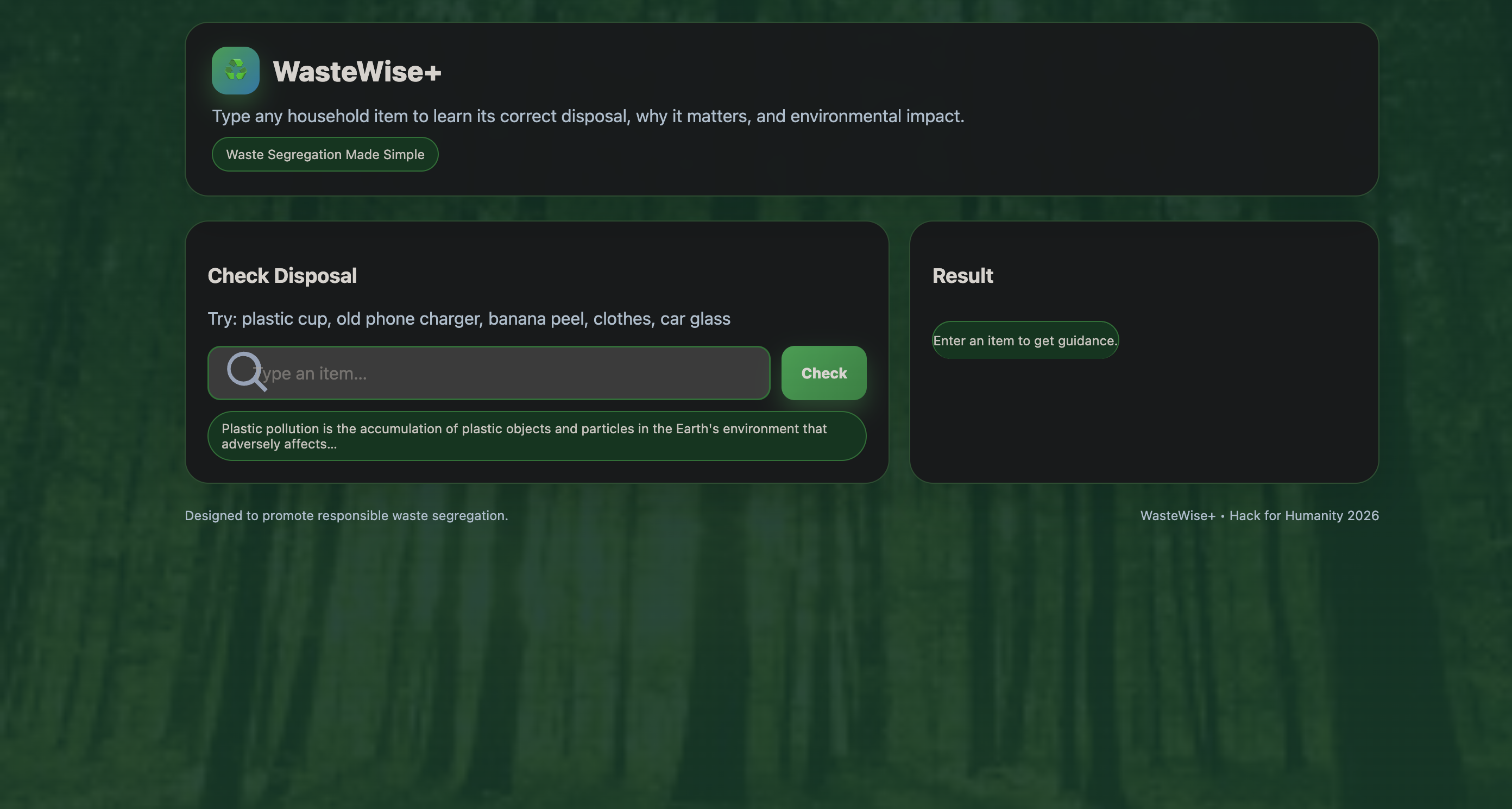 WasteWise+ is a lightweight web application built using HTML, CSS, and vanilla JavaScript.
