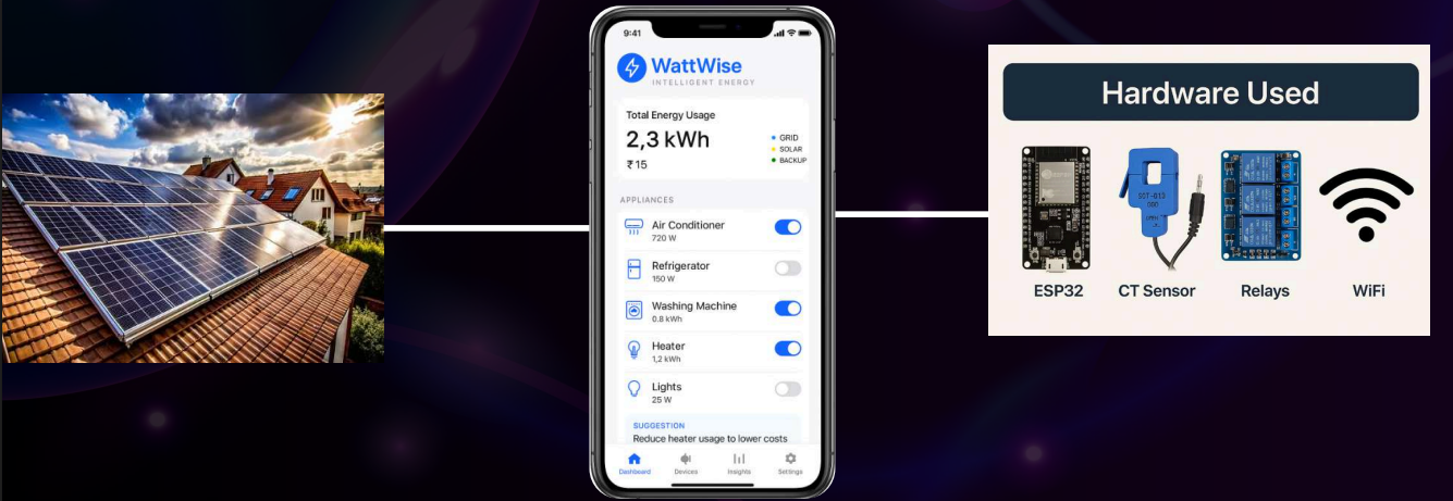 What it does WattWise is a smart energy monitoring system that tracks real-time electricity usage per appliance. It offers detailed insights, alerts users of over-usage, and suggests energy-saving measures—helping users save money and reduce their carbon footprint.