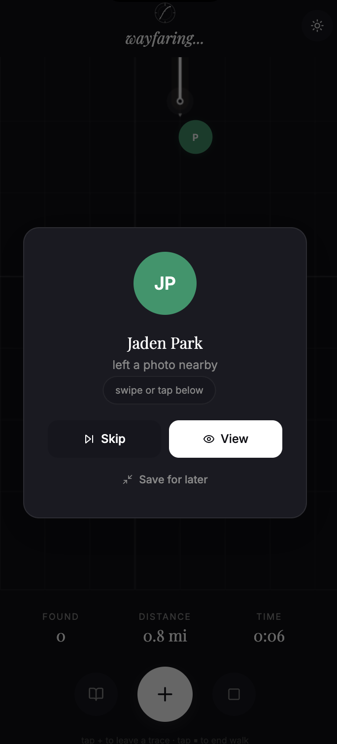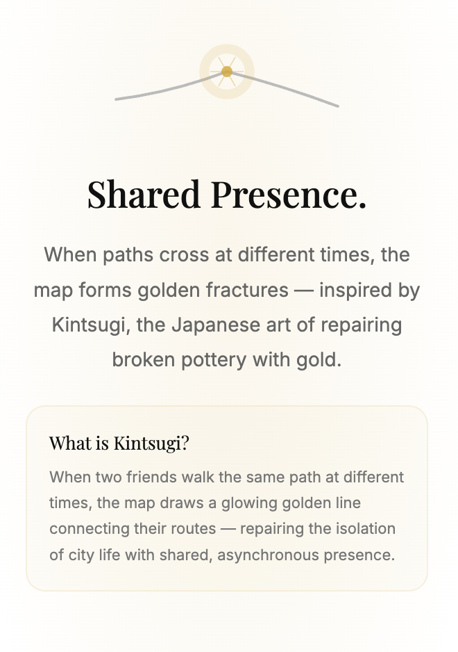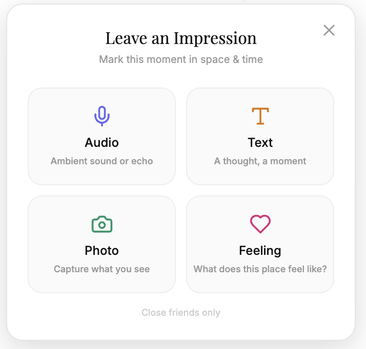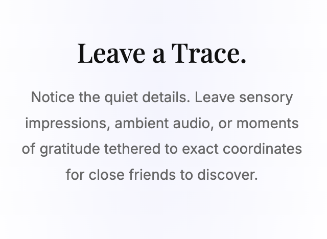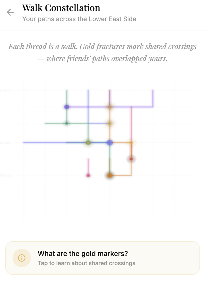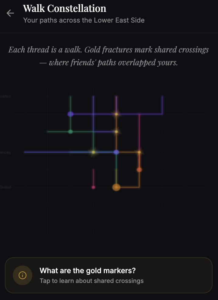 So this project is a good mix between walking and journaling. You can open this app to track your walks, see your history, and attach a memory to a physical place. It connects the kind of intangible, ethereal concept of memory and experience, and notes it down at a place in time and space. It also allows you to see what others have created and shared in this physical/digital connector.