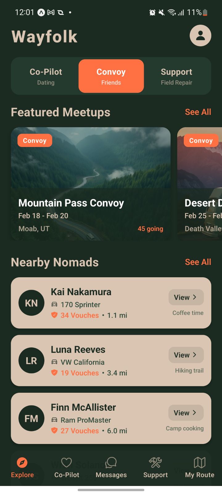 Wayfolk was inspired by the unique challenges of the "Van Life" movement, specifically the problem of Nomadic Isolation. Traditional social apps fail nomads because they are built for static locations. Based on Quinn's pitch, we realized that in a life defined by movement, matching based on current coordinates isn't enough, you need to match based on travel trajectories. We wanted to build a "digital backbone" that solves the trajectory mismatch, addresses the safety gap for solo travelers, and provides a mission-critical marketplace for rig repairs.