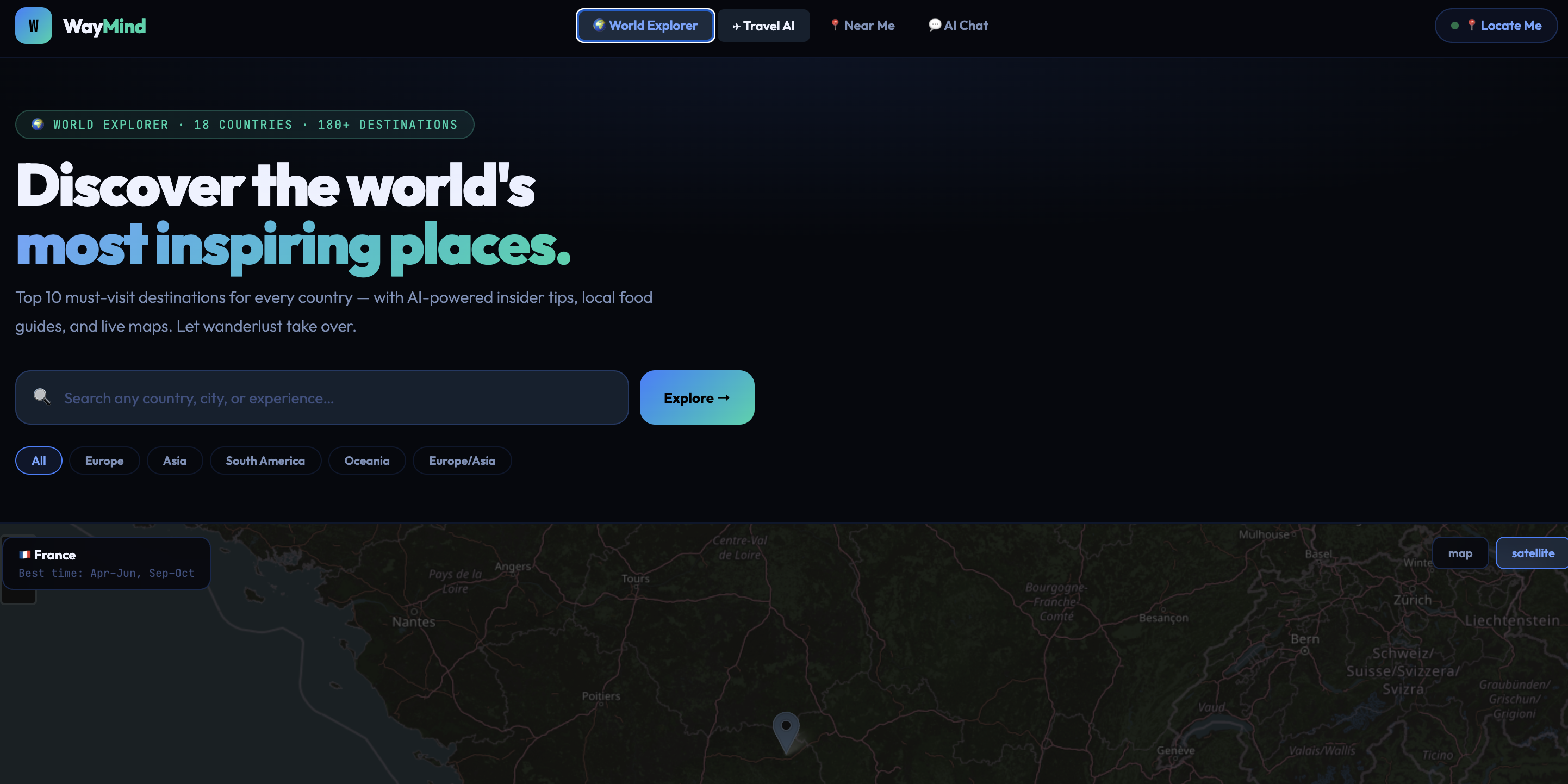 WayMind is a real-time AI travel intelligence platform with four core features. The World Explorer lets users browse top 10 must-visit destinations across 10 countries with real photography, AI insider tips, live maps, and local food guides. The Travel Disruption AI autonomously detects flight delays and cancellations, finds alternative flights, rebooks the best option, updates the itinerary, and notifies contacts — without the traveler lifting a finger. Near Me uses GPS to proactively suggest restaurants, cafés, sightseeing spots, and business lounges based on location, time of day, and trip purpose. The AI Chat assistant answers any travel question instantly using Claude AI — from visa requirements to hidden gems.