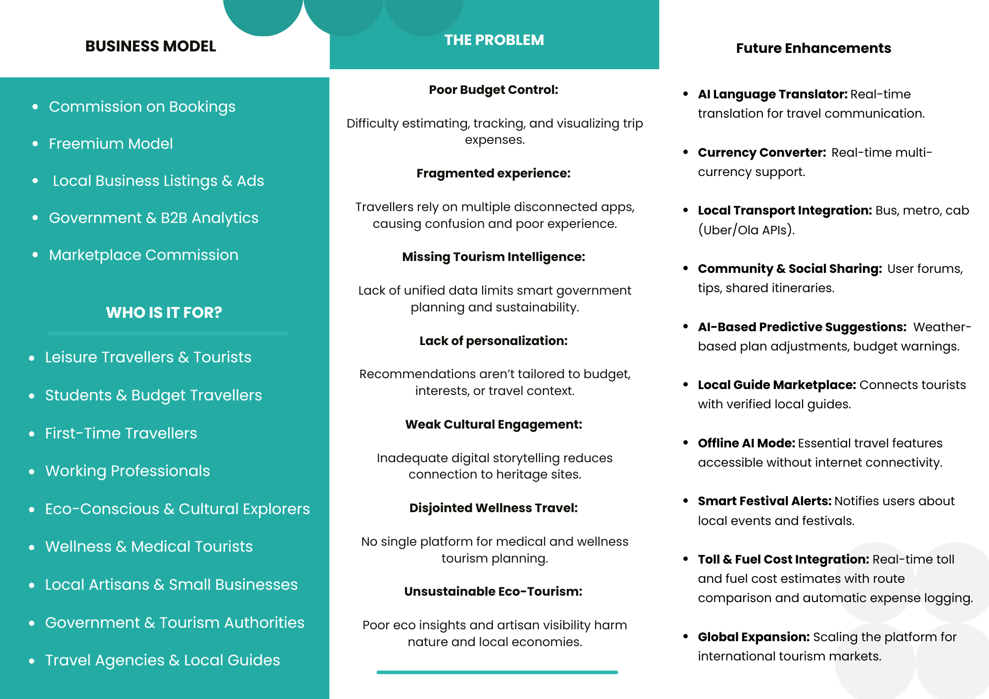There is also limited cultural engagement, where travellers visit destinations without meaningful interaction with heritage, local stories, or authentic experiences. Local artisans and small businesses often lack digital visibility, reducing opportunities for them to benefit from tourism.