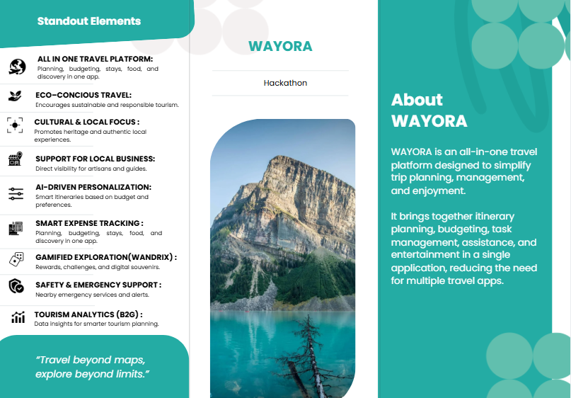 Wayora is an all-in-one smart travel platform that simplifies trip planning, budgeting, and exploration while enhancing the travel experience through personalization, AI assistance, and gamification.
