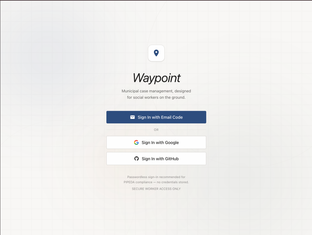 - Security & Identity (Auth0): Because municipal case notes contain highly sensitive PHI (Protected Health Information), we integrated Auth0 Universal Login. To balance HIPAA/PIPEDA compliance with field convenience, we implemented Passwordless Email OTP.