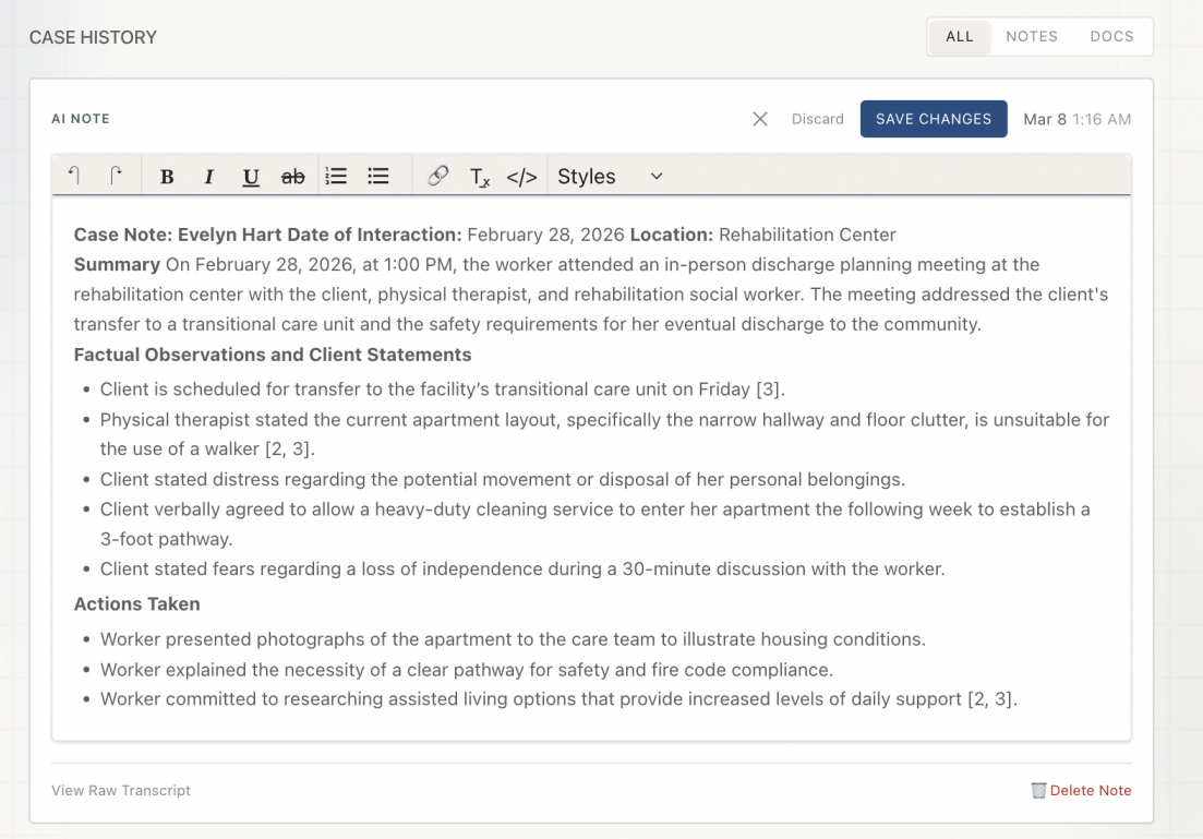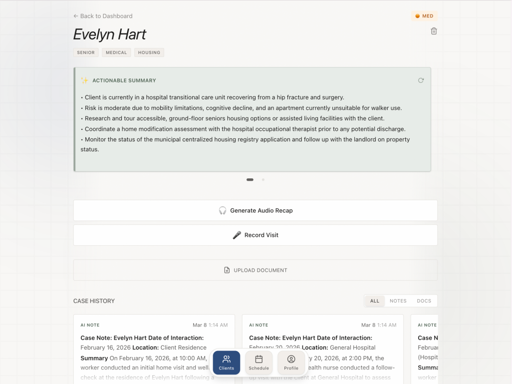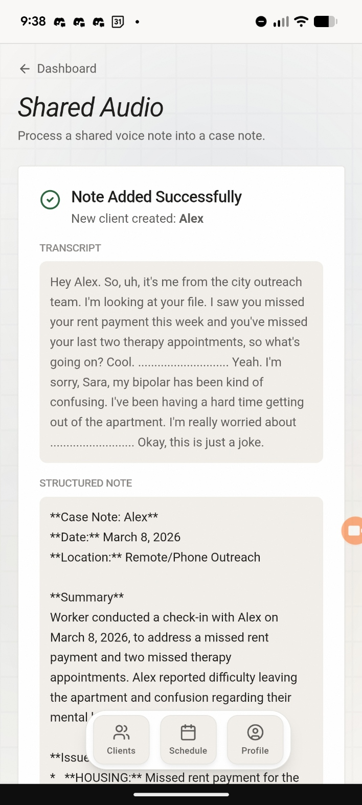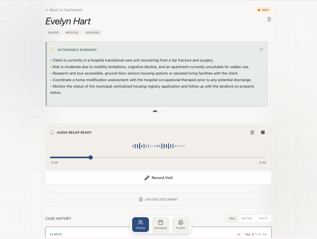 After a client visit, a worker can record a voice memo directly from their phone. That specific audio is transcribed and transformed into a structured case note. The system formats the note into objective language, extracts key identities, applies tags, and organizes it into the clients timeline.