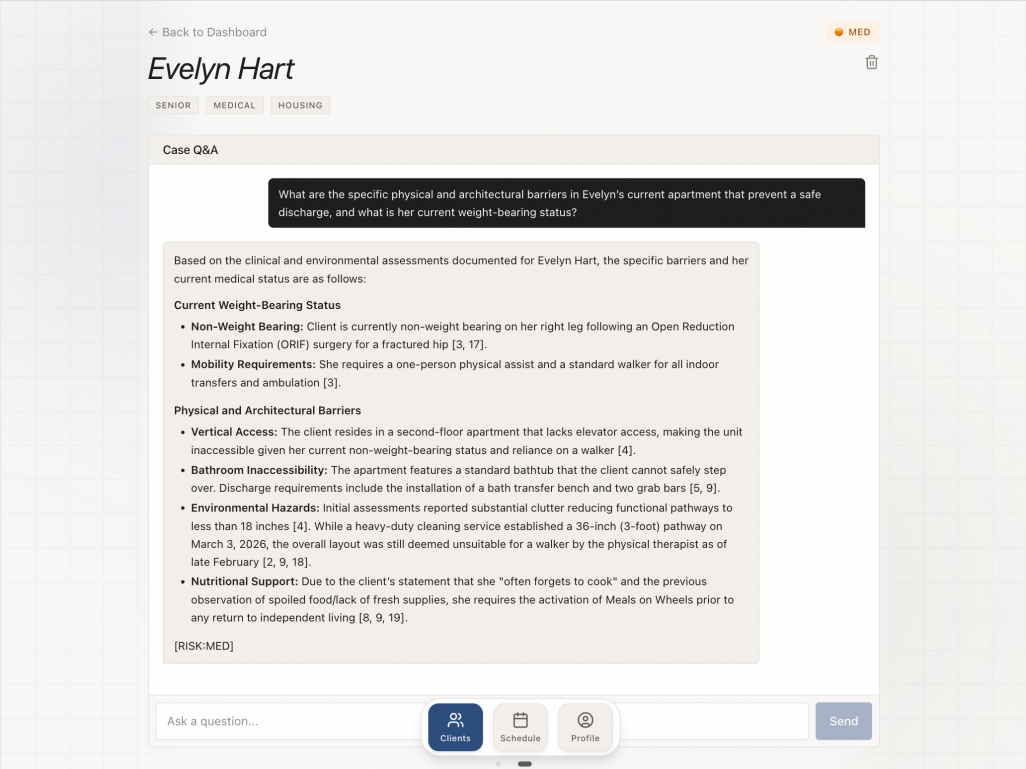 Each client has a persistent memory thread that acts like an evolving case intelligence layer. This is not just a notes database. It is a contextual memory system that allows workers to ask natural language questions and get grounded answers. For example: