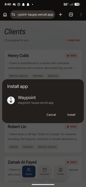 Waypoint was built to solve exactly that. It is designed around the actual field reality of social works: mobile, high-stress, time-constrained, and continuity-sensitive. Instead of forcing workers to adapt to office software, Waypoint adapts to the worker.