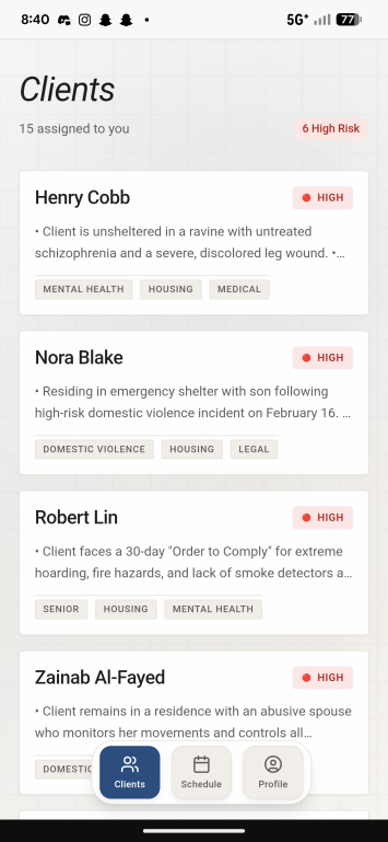 Social workers are some of the most overworked and underappreciated individuals. They’re constantly moving between shelters, housing units, hospitals, and more to help those in need. Yet, most of their platforms are still largely designed for stationary, desktop based workflows. They have to spend 65% of their time doing paperwork, and have to juggle the burden of 40-60 clients at once.